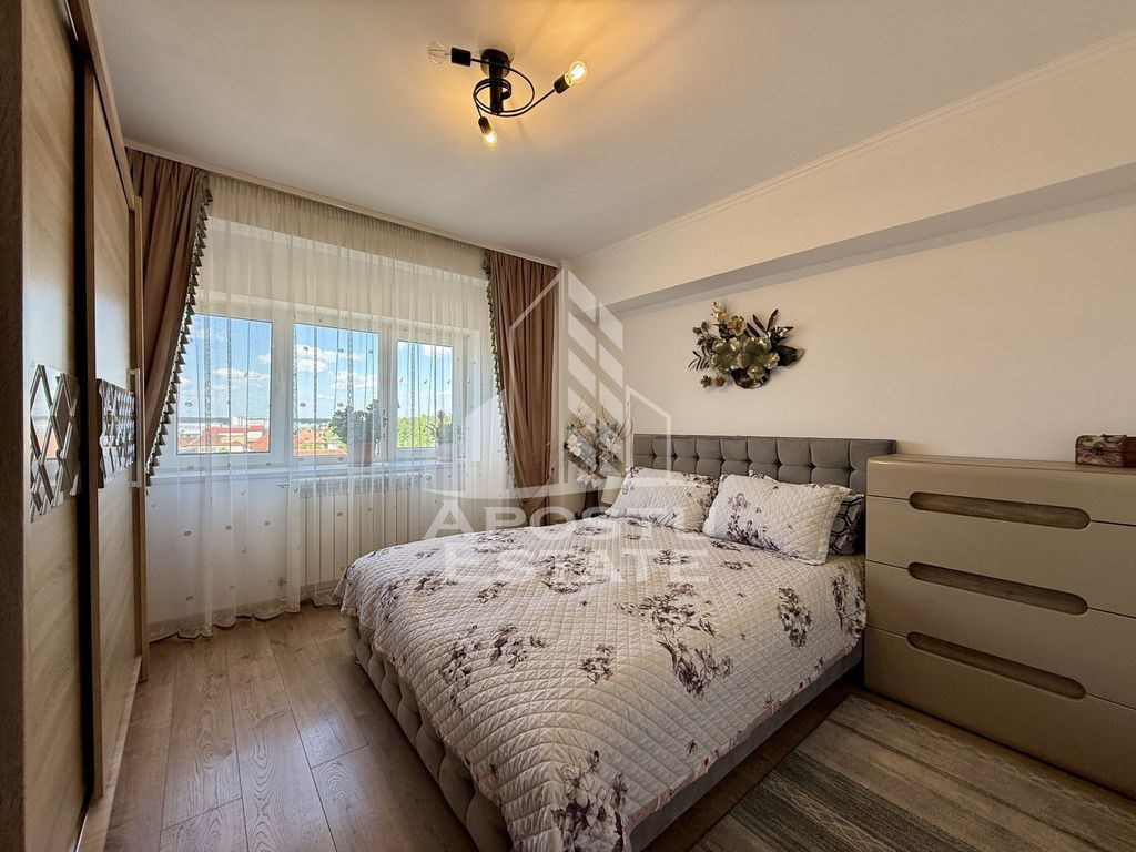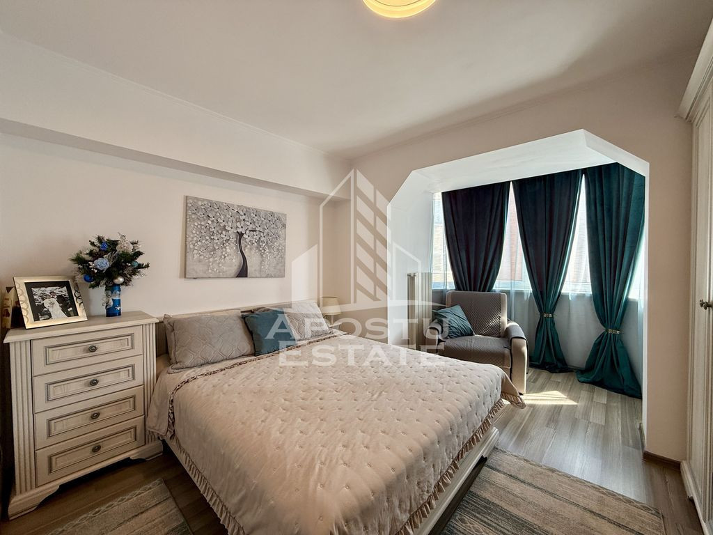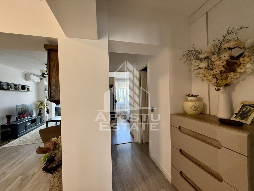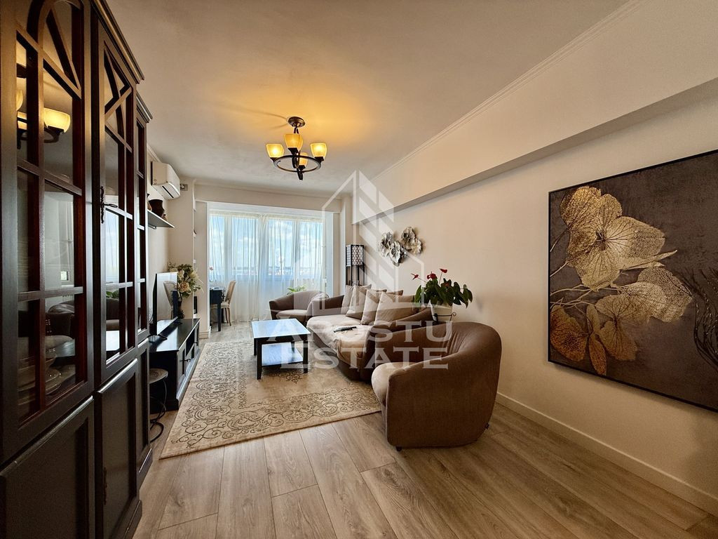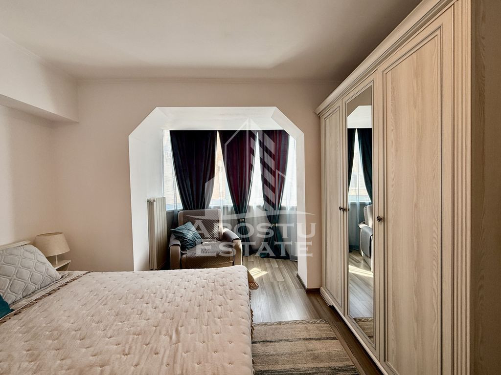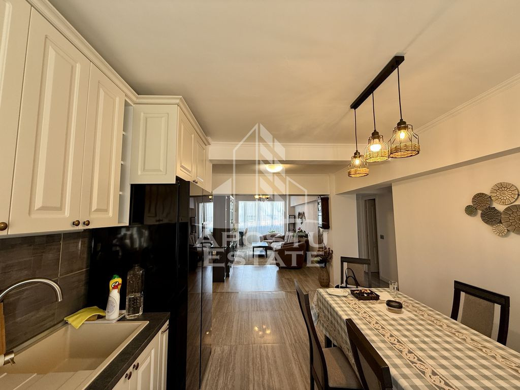APOSTU ESTATE va propune spre vanzare un apartament cu 3 camere, decomandat, situat in zona Modern din Timisoara, ideal pentru locuinta de familie sau investitie imobiliara. Apartamentul este pozitionat la etajul 7 din 7, intr-un imobil cu lift functional, beneficiind de o suprafata utila de 74 mp si de o compartimentare echilibrata, care ofera confort si intimitate. Caracteristici si dotari: - instalatii electrica si sanitara schimbate complet - incalzire de la reteaua centralizata Colterm - 2 balcoane inchise, unul in living si unul in dormitor - aer conditionat instalat - se vinde partial mobilat si utilat Compartimentare: - living spatios cu bucatarie open-space si balcon inchis - 2 dormitoare decomandate, unul cu acces la al doilea balcon - baie principala cu cada - a doua baie transformata in spatiu de depozitare (debara) Avantaje cheie: - etaj 7/7 cu lift - vedere panoramica - suprafata utila de 74 mp - apartament decomandat, bine intretinut - zona linistita si accesibila – cartier Modern - aproape de scoli, magazine, mijloace de transport si alte puncte de interes, magazine, farmacii, institutii bancare Pentru mai multe informatii si programari la vizionare, va asteptam cu drag.