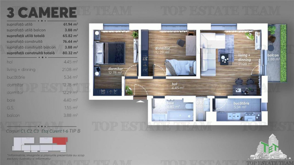 Excelenta prin experienta! Va propunem la vanzare un apartament de 3 camere decomandat, cu 2 bai, intr-un bloc modern finalizat din sectorul 6 al capitalei. PROMOTIE pana la final 2025! Constructie solida pe cadre de beton si caramida, peste media zonei de vest. Materiale si finisaje de calitate. Apartamentul se afla la etajul 4 intr-un bloc cu 7 nivele. Suprafata utila 62mp suprafata totala cu balcon deschis 66mp. Compartimentare de tip decomandat. Avem si alte modele 3 camere disponibile (pana la 77mp totali la 127000 EURO TVA) Utilitati si dotari: apa, gaze, curent, canalizare, interfon, lift, internet, supraveghere video, centrala proprie pe gaz. Program de vizionare flexibil, inclusiv seara sau weekend (cu programare in prealabil) Poze reale dintr-un apartament partial mobilat ca showroom (se poate vinde inclusiv acesta mobilat dar cu termen de mutare mai larg - *doar pentru investitie) Apartamentul se vinde pentru pretul de 126930 EURO (TVA inclus). Posibilitate de a achizitiona suplimentar locuri de parcare la 8400 EURO/unitatea. Oferim consultanta gratuita pentru obtinerea de credit ipotecar.