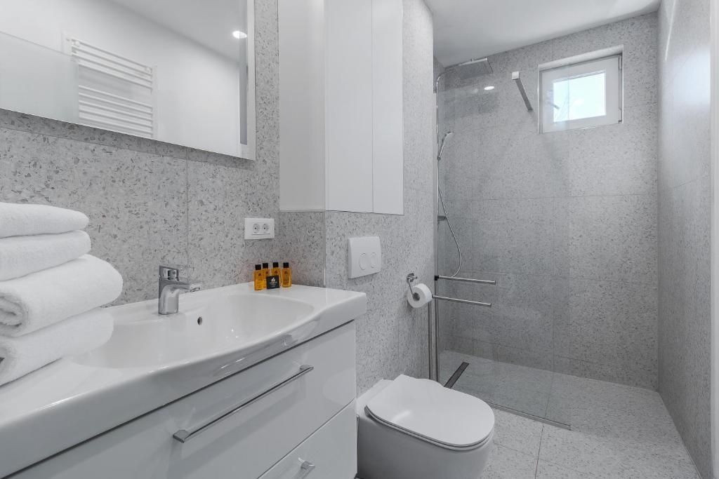 1 baie modernă cu duș și articole de toaletă incluse