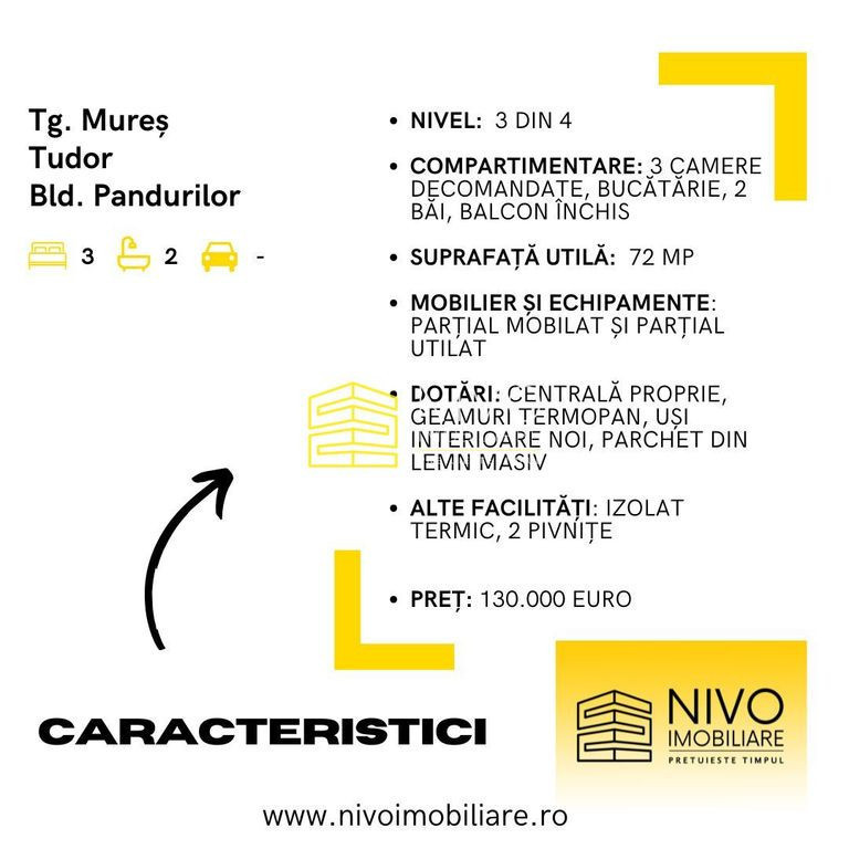 BV/342 Nivo Imobiliare vă propune spre vânzare acest apartament situat în Tg. Mureș, cartierul Tudor, Bld. Pandurilor. Apartamentul se află la etajul 3 din 4 şi este compus din 3 camere decomandate, bucătărie, 2 băi şi balcon închis având suprafața utilă de 72 mp. Este izolat termic, dotat cu panouri electrice, boiler pentru apă, geamuri termopan, uși interioare noi și parchet din lemn masiv. Dispune de 2 pivnițe. Se vinde parțial mobilat și parțial utilat la prețul de 130.000 Euro. 0% comision pentru cumpărător.