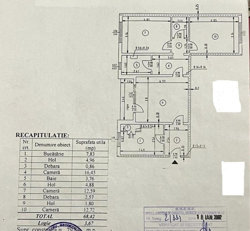 APARTAMENT 3 CAMERE, ZONA CENTRU, VIEW SPECTACULOS, 75.000 EURO FORTUNA IMOBILIARE oferă spre achiziționare acest apartament cu 3 camere, situat în zona centrala a Municipiului Piatra Neamț, la etajul 10, într-un bloc acoperit cu pod și prevăzut cu lift, cu o vedere panoramică, ce asigură o priveliște unică a orașului Piatra Neamț - peisaj montan, verde și aer curat. Are suprafața utilă de 68,42 mp + 3,67 mp suprafață logie ( suprafața construită de 79,84 mp), este luminos și călduros, cu orientare cardinală EST-VEST, fiind prevăzut cu îmbunătățiri: termosistem integral exterior, ușă antiefracție, acces controlat prin interfon, centrală termică, termopane, uși interioare, gresie, faianță, parchet. Beneficiază de următoarea compartimentare: 3 holuri, cameră de zi, 2 dormitoare, baie ( cu aerisire naturală), debara, bucătărie și balcon tip logie. Are toate actele la zi, se vinde așa cum este prezentat în fotografii, iar dispoziția posesiei imobilului se face la semnarea actelor de vânzare. Preț 75.000 euro. Pentru o prezentare detaliată a acestei oferte, furnizarea unor informații suplimentare referitoare la situația juridică / identificarea imobilului și programarea unei vizionări, vă invităm la sediul nostru, Fortuna Imobiliare, situat pe str. M. Eminescu, nr. 35, ap. 13, parter, lângă fostul Tribunal, tel. contact 0755.270.041. Your comfort is our priority ! Oferta noastră completă o găsiți aici: https://imobiliarefortuna.ro/