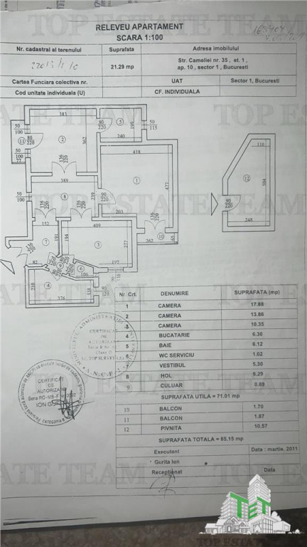 Excelenta prin experienta! Va prezentam spre vanzare o oportunitate de investitie intr-o cladire cu istorie si personalitate, situata central, in zona celebrei Piete a lui Matache, intre Berzei si Gara de Nord, la cateva minute de Calea Victoriei. Apartamentul se compune din 3 camere cu o suprafata utila de 71 mp si una totala de 85 mp (include 2 balcoane si o pivnita generoasa de 10 mp). Este un apartament cu un potential mare pentru amenajare , cu o structura deosebita la interior, specifica cladirilor interbelice . Pastreaza elemente originale (sobe, cada ,usi interior, parchet etc ) ce pot da un parfum vintage, odata restaurate . Toate geamurile si balcoanele dau spre curtea interioara , respectiv lateral cladire, ceea ce il face foarte silentios, potrivit deopotriva pentru un birou, locuinta sau airbnb. Proprietatea a fost intretinuta foarte bine, insa necesita investitiii pentru modernizare - a fost locuita pana nu demult dar imbuntatirile aduse au fost minime ( detine geamuri termopan, sobe pe gaz functionale, mobila stil clasic in stare foarte buna ). Imobilul a fost recent incadrat la RS 1 insa nu are bulina pusa pe cladire . Proprietatea se vinde cu tot ce exista in ea , pretul este negociabil. Pentru detalii va stam stam la dispozitie la numarul de telefon si va invitam la vizionare ! ID intern: TET0020288