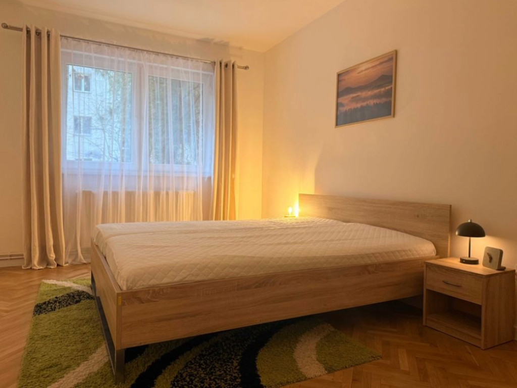 Apartament decomandat cu 3 camere de închiriat – Mănăștur, zona Grădini Mănăștur Agenția noastră vă propune spre închiriere un apartament decomandat cu 3 camere, situat în Cluj-Napoca, cartier Mănăștur, zona Grădini Mănăștur, pe strada Tarnita – o zonă foarte căutată, liniștită și cu acces facil către punctele de interes ale orașului. Caracteristici generale: • Suprafață utilă: 79 mp • Etaj: Parter • Imobil reabilitat termic • Compartimentare decomandată • Complet mobilat și utilat Compartimentare: • Living spațios • 2 dormitoare • Bucătărie separată, complet utilată • 2 băi (baie principală cu cadă + baie de serviciu) • Hol generos • Cămară / spațiu de depozitare Dotări: • Centrală termică proprie • Plită cu inducție • Cuptor • Frigider • Mașină de spălat vase • Mașină de spălat rufe • Uscător de rufe Apartamentul este ideal pentru o familie sau pentru persoane care își doresc un spațiu generos, într-o zonă verde și liniștită. Preț: 800 euro/lună, neg
