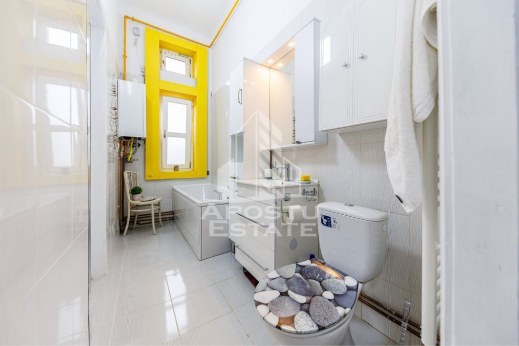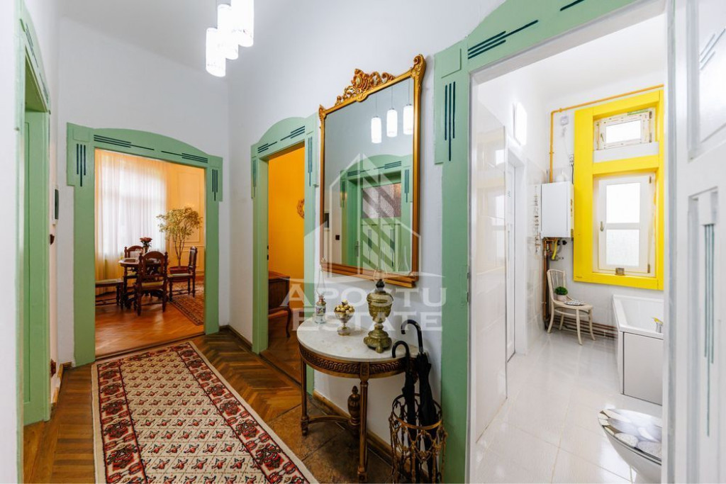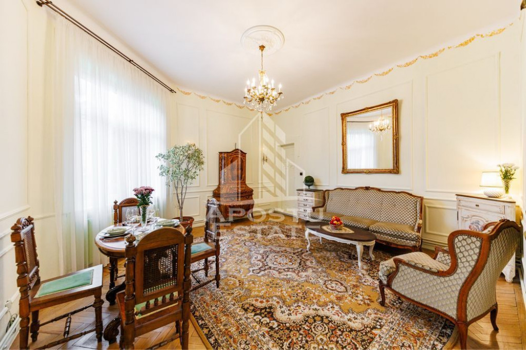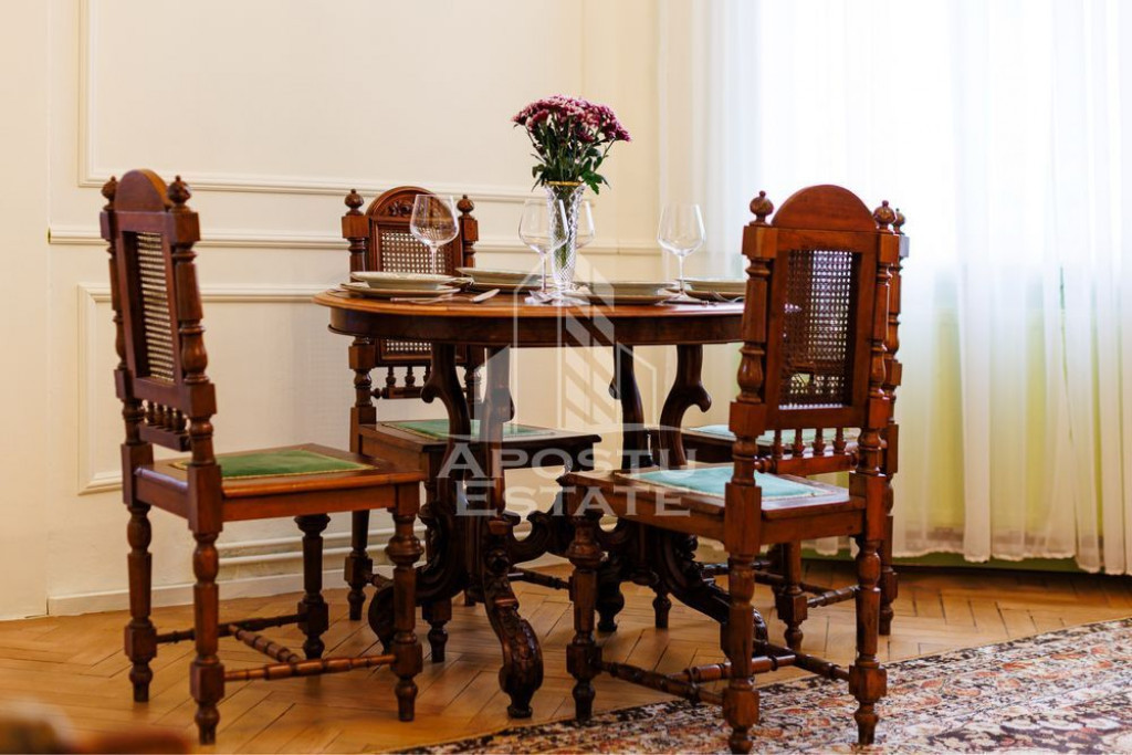 Apostu Estate va propune spre vanzare apartament exclusivist cu o suprafata de 75 mp Piata Maria. Este situat intr-o cladire istorica in curs de reabilitare cu regim de inaltime D+P+2 in stilul arhitectural Art Nouveau/Secession. Apartamentul este situat la etajul 1 al cladirii. A fost recent renovat complet de la rosu, incluzand instalatia electrica, sanitara, de incalzire etc. , niciun aspect nefiind neglijat. Toate lucrarile s-au efectuat asumat fara rabat la calitate, nealterand spiritul istoric al cladirii.Usile interioare au ramas cele originale, au fost atent reabilitate dand o nota si un ambient deosebit. Apartamentul ofera o suprafata utila de 75 mp compus din 2 camere spatioas, bucatarie si baie cu geam pentru aerisire. Bucataria luminata natural, situata central, amenajata intr-o maniera simpla, aerisita, totodata practica si functionala. Mobilierul efectuat la comanda cu linia de aparate electrocasnice de lux, aleasa din gama vintage completandu-se perfect cu ambientul locuintei unde predomina ziduri groase si usi inalte din lemn. Toate piesele de mobilier sunt alese cu o o intreaga atentie, multe dintre ele fiind din lemn masiv reconditionat. Cele doua candelabre lucrate manual pun armonios in lumina decorul si arhitectura camerelor. Incalzirea apartamentului se realizeaza prin intermediul centralei proprii pe gaz. Se vinde complet mobilat si utilat precum se poate vedea in poze. Va asteptam cu drag la vizionare!