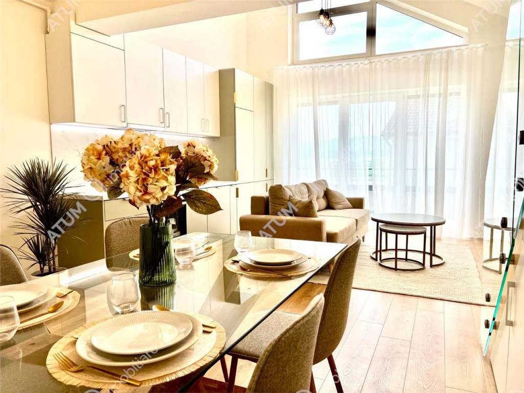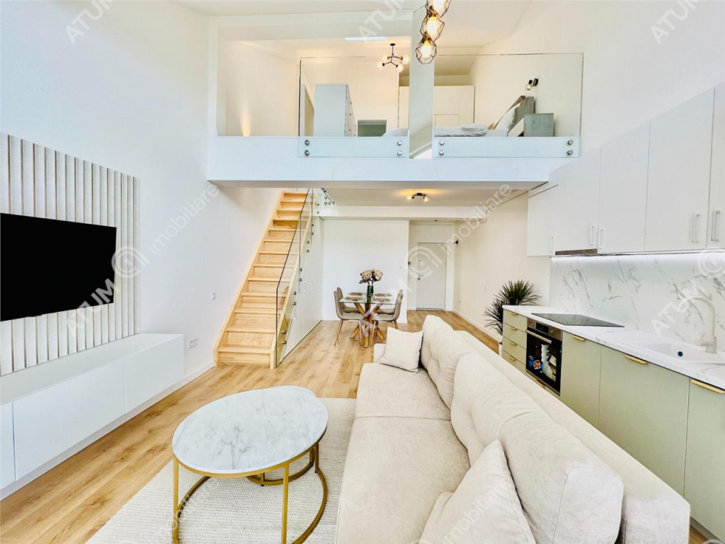 Oferim spre vanzare acest superb apartament de tip penthouse, format din 2 camere, terasa si loc de parcare, situat in zona de Vest a Sibiului. Apartamentul a fost recent finisat, complet mobilat si utilat, este pozitionat la etajul 2 mansarda amenajata si intabulata, intr-un imobil nou, locatia acestuia icirc;ti permite sa te bucuri de un stil de viata activ, icirc;ntr-o zona apreciata pentru echilibrul perfect icirc;ntre natura si accesibilitate urbana. Proprietatea insumeaza 56 mp utili 8 mp terasa, fiind compartimentata astfel: la primul nivel se afla un hol, baie cu cada, living generos de tip open-space cu bucataria si iesire pe terasa iar la al doilea nivel se afla un dormitor matrimonial cu acces la un dressing si o baie cu dus walk in. Fiecare detaliu fost ales cu atentie pentru a asigura un ambient placut si functional. Dotarile si imbunatatirile existente sunt de calitate superioara: usa de metal la intrare placata cu panou MDF, tamplarie PVC cu 3 foi de sticla si rulouri exterioare actionate electic, izolatie termica si fonica la exterior si interior cu vata bazaltica, centrala termica in condensatie, incalzire prin pardoseala la ambele niveluri, pereti gletuiti si zugraviti in lavabil, parchet laminat, gresie, faianta, obiecte sanitare, mobilier in toate incaperile, usi de interior, toata gama de electrocasnice noi, in garantie (TV, frigider, masina de spalat rufe, masina de spalat vase, cuptor si hota electrice, plita prin inductie). Descopera acest apartament premium, foarte luminos si calduros, complet nou, care sa fie doar al tau de la icirc;nceput. Fie ca icirc;ti doresti momente de relaxare, priveliste superba asupra imprejurimilor, acces rapid la facilitati sau un loc special pentru familia ta, aici vei gasi exact ce cauti. Apartamentul este disponibil imediat si se vinde la pretul de 127.900 euro negociabil. Va astept cu drag la o vizionare! ID intern: 3036.