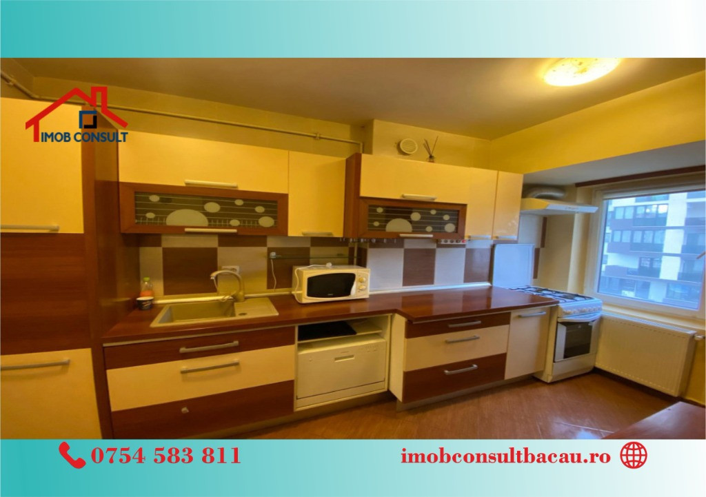 Imob Consult Bacău îți propune spre închiriere un apartament cu 2 camere, situat într-un bloc nou – ADAMA, la etajul 2, perfect pentru cei care își doresc un spațiu primitor și bine poziționat. Locuința beneficiază de o compartimentare decomandată, oferind intimitate și funcționalitate, precum și de o suprafață utilă generoasă, care asigură confortul de zi cu zi. Apartamentul este complet mobilat și utilat, pregătit pentru a deveni „acasă” din prima zi. Printre dotări se numără centrala termică proprie, pentru eficiență și control asupra consumului, precum și tâmplărie PVC cu geam termopan, ce asigură izolare termică și fonică optimă. Zona este excelentă, cu acces facil către puncte de interes, fiind ideală atât pentru cupluri, cât și pentru persoane active care apreciază confortul urban. Prețul de închiriere este de 380 euro/lună. Pentru vizionări și relații suplimentare, te invităm să ne contactezi: • Cozmin: 0754 583 811; • Corina: 0740 288 297, Sau te așteptăm la sediul agenției noastre, Imob Consult Bacău, situat pe strada Banca Națională nr. 27, la intersecția cu Str. Neagoe Vodă, lângă Irish Pub.