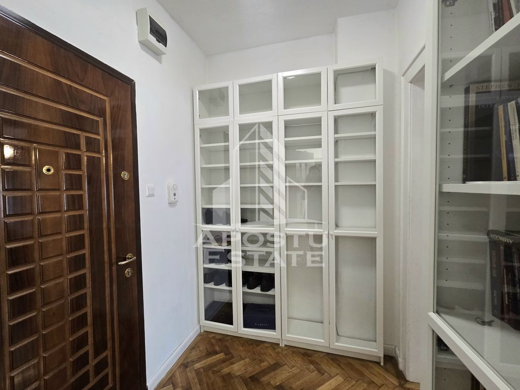 Apostu Estate va ofera spre vanzare un apartament exclusivist cu 2 camere, situat in zona Ultracentrala, la cativa pasi de Primarie. Proprietatea se afla la etajul 2 al unei vile istorice proiectate de arhitectul Albert Krausz, o constructie deosebita cu doar 2 etaje, ce imbina rafinamentul arhitecturii clasice cu confortul modern. Apartamentul are o suprafata utila de 45 mp si a beneficiat de renovari recente. Instalatiile electrice si sanitare au fost complet inlocuite, iar parchetul din lemn masiv a fost reconditionat si se prezinta impecabil. Usile originale, ferestrele si rulourile din lemn au fost restaurate cu atentie, pastrand autenticitatea si eleganta imobilului. Compartimentarea este eficienta si functionala, oferind confort si luminozitate: hol de acces cu spatii de depozitare, living cu bucatarie open space, dormitor cochet cu vedere spre oras si baie cu vana. Confortul termic este realizat prin intermediul termoficarii si al aparatului de aer conditionat. Exista posibilitatea montarii centralei proprii pe gaz. Apartamentul se vinde complet mobilat si utilat la standarde inalte: aer conditionat, masina de spalat vase incorporabila, masina de spalat rufe, uscator, plita electrica cu inductie, cuptor electric, frigider, hota performanta si silentioasa, precum si semineu electric pentru un plus de atmosfera. Aceasta proprietate reprezinta o oportunitate rara de achizitie in inima orasului, ideala atat pentru rezidenta, cat si pentru investitie. Se vinde complet mobilata si utilata, precum in imagini. Pentru detalii suplimentare si programarea unei vizionari va stam cu drag la dispozitie. Oferim consultanta bancara gratuita prin intermediul colaboratorilor nostri.