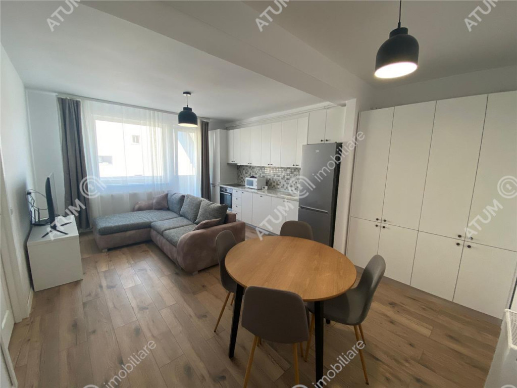 Apartament cu 2 camere de inchiriat in Sibiu zona Vasile Aaron, acesta este pozitionat la etajul 2 al unui imobil cu 3 etaje si beneficiaza de loc de parcare propriu. Suprafata utila a locuintei este de 43 mp si sunt compartimentati astfel: living bucatarie 21.68 mp, dormitor 12.64 mp, baie 5.62 mp si hol de 3 mp, iar pe langa toata aceasta suprafata utila se mai adauga un balcon de 4.68 mp. Blocul din care face parte a fost edificat pe structura de beton tip cadre in anul 2022 si este situat intr-o zona aerisita, cu acces la o promenada pietonala, avand mult spatiu verde in jur. Apartamentul beneficiaza de usa metalica la intrare, tamplarie PVC Veka cu 7 camere si 3 foi de sticla, centrala termica proprie cu incalzire pe calorifer, gresie, faianta, parchet. Locuinta se preda complet mobilata si utilata cu electrocasnice noi, in garantie: cuptor, hota, plita electrica, masina de spalat vase, frigider si masina de spalat rufe. Zona in care se afla este una de blocuri cu nivel redus de inaltime si case, avand acces rapid in strada Semaforului, mall-ul Shopping City si multe altele. Pretul de inchiriere al acestui apartament este de 370 euro. ID intern: 3408.