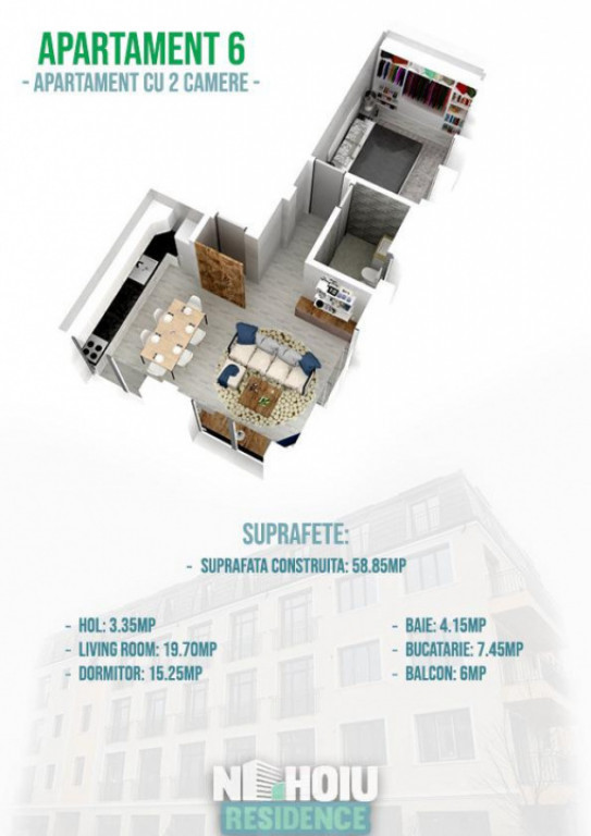 Va propunem un apartament de vanzare de 2 camere in Ansamblul Rezidentail Nehoiu Residence. Nehoiu Residence este un proiect imobiliar nou, in orasul Nehoiu, Buzau, dezvoltat pe 3 principii solide: Siguranta, Confort si Zero compromisuri. Fiind situat in zona centrala a orasului, Nehoiu Residence dispune de toate facilitatile de care ai nevoie: supermarket, scoala, banca, la doar cativa pasi, facand traiul mult mai confortabil. Pentru ca mediul urban este din ce in ce mai aglomerat, poluat si stresant, am vrut ca Nehoiu Residence sa fie oaza de relaxare in mijlocul naturii. Siguranta Construit dupa ultimele standarde europene in domeniu, in construirea cladirii au fost efectuate toate testele de siguranta si s-au folosit doar materiale de top, de catre constructori de top. Zero Compromisuri Totodata stim ca omul modern are nevoie de o viata tehnologizata asa ca nu am facut niciun compromis. Cladirea P+3E si mansarda vine cu toate facilitatie. Apartamentul 6 este compus din : 1- Camera de zi de 20.3 mp 2- Dormitor de 14.4 mp 3- Bucatarie de 6.9 mp 4- Baie de 4.1 mp 5- Hol de 3.4 mp 6-Balcon 9 mp Id intern: P3788