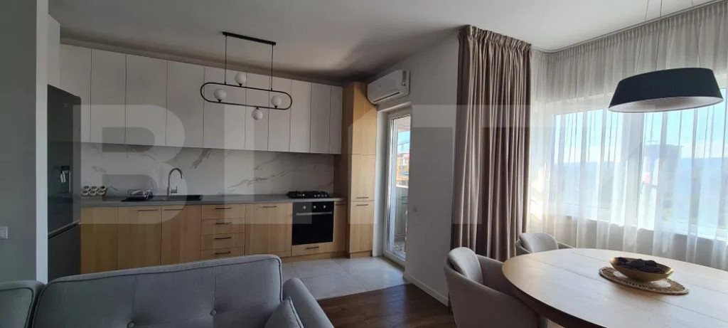 Blitz vă oferă spre închiriere un apartament premium, elegant și perfect echilibrat între confort și rafinament, ideal pentru cei care apreciază un stil de viață modern într-un ambient primitor. Amenajat cu atenție la detalii și finisaje de calitate superioară, acest apartament impresionează prin designul contemporan și atmosfera caldă, creată de combinația armonioasă între tonurile de lemn și accentele de alb. Zona de living open-space se îmbină perfect cu bucătăria complet mobilată și utilată, oferind un spațiu aerisit și funcțional, ideal atât pentru relaxare, cât și pentru momentele petrecute alături de cei dragi. Bucătăria este dotată cu electrocasnice moderne (plită, cuptor, frigider) și beneficiază de spații generoase de depozitare. Zona de dining, scăldată în lumină naturală datorită ferestrelor ample, creează cadrul perfect pentru mese plăcute și momente de relaxare. Dormitorul spațios este gândit ca un refugiu de liniște, fiind dotat cu pat matrimonial confortabil, dulap încăpător și un design modern care inspiră relaxare. Baia elegantă completează armonios locuința, fiind finisată cu materiale premium și echipată cu cadă/duș, precum și spații de depozitare intelig integrate. Puncte forte: -Design contemporan și finisaje premium -Compartimentare eficientă și funcțională -Lumină naturală din abundență -Spații de depozitare bine optimizate -Ideal pentru cupluri sau persoane singure -Acces facil la magazine alimentare și bănci În plus, apartamentul dispune de loc de parcare subteran, oferind un plus de confort și siguranță. Această proprietate este alegerea perfectă pentru cei care își doresc un cămin modern, elegant și gata de mutat imediat. Cod ofertă / ID BLITZ: P169551 Id intern: P169551