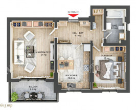 Locuinta are 61.30 mp si este compusa din camera de zi 21.00 mp, dormitorul de 12.00 mp, bucataria inchisa 12.30 mp, baia 6.30 mp prevazuta pentru cada si dotata cu geam pentru aerisire si holul de 9.70 mp cu multiple saptii dedicate depozitarii si pozitionarii cuierului cu pantofar. Separat de suprafata utila amintim si balconul tip terasa de 8.50 mp.