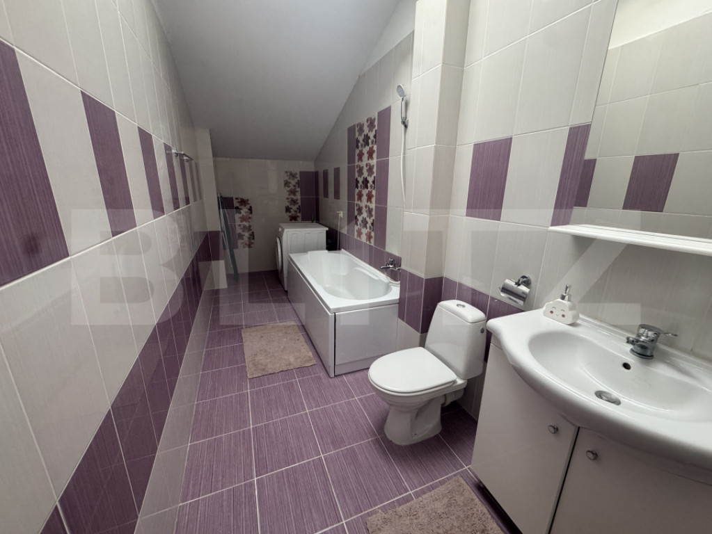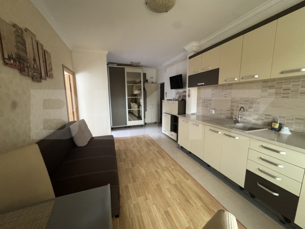 Blitz propune spre vânzare un apartament cu 2 camere, excelent optimizat și finisat la standarde moderne, ideal pentru a fi locuința dumneavoastră sau o investiție inteligentă cu randament rapid. Ambient și Compartimentare • Design Contemporan: Proprietatea se vinde complet mobilată, cu finisaje moderne (parchet, gresie, faianță, uși interioare de calitate). • Zona de Zi Eficientă: Livingul (cu canapea și zonă TV) se integrează fluid cu bucătăria, creând un spațiu social generos și foarte luminos. • Bucătărie Funcțională: Mobilă în două tonuri (bej și wenge/maro închis) și spațiu de depozitare optimizat. • Dormitor Confortabil: Spațiu generos, echipat cu pat matrimonial cu spații de depozitare integrate și zonă de lucru/dressing. Baie Elegantă: Placată cu gresie și faianță în tonuri de alb și mov/lila, dotată cu cadă, obiecte sanitare moderne și mașină de spălat rufe. (Se remarcă tavanul înalt și lumina naturală tip velux). • Balcon Tip Terasă: Spațiul vitrat de 4 mp poate fi folosit ca zonă de relaxare, lectură sau birou, oferind o priveliște deschisă și lumină naturală excelentă. • Confort Climatic: Dotat cu aer condiționat în zona de zi. • Investiție Fără Risc: Apartamentul nu necesită reparații sau îmbunătățiri majore, fiind gata pentru noul proprietar sau pentru închiriere imediată. Vă așteptăm cu drag! Cod ofertă / ID BLITZ: P156500 Id intern: P156500