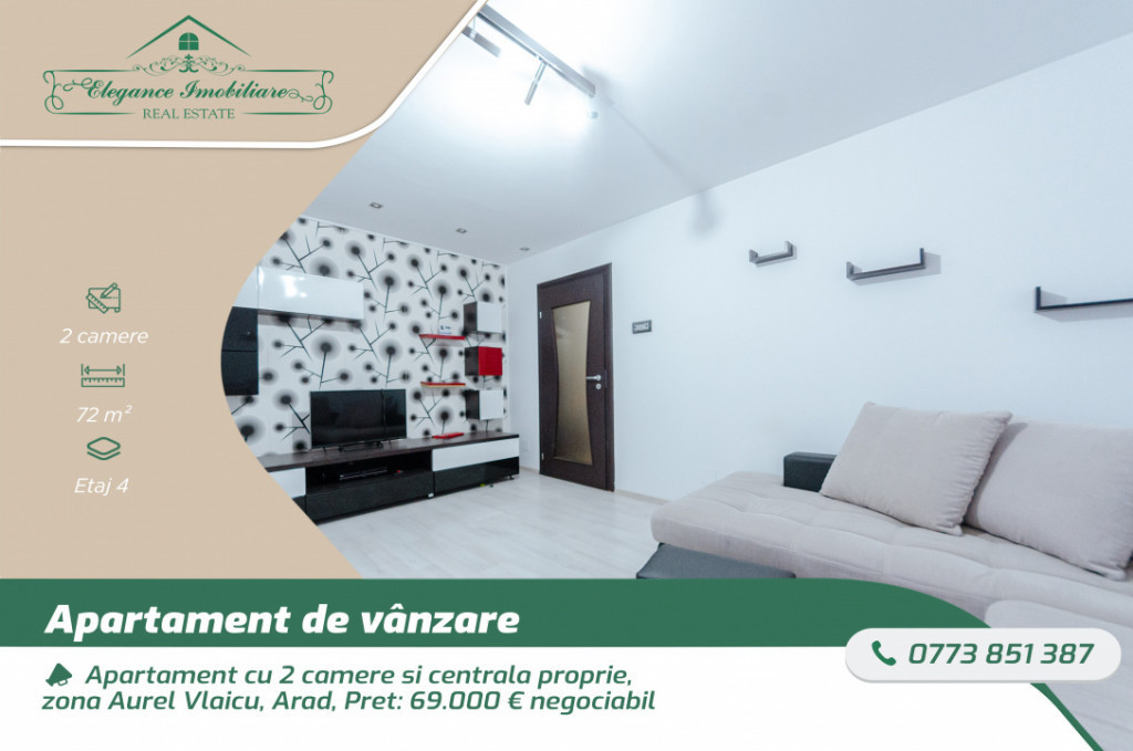 Elegance Imobiliare vă propune spre achiziție un apartament cu 2 camere situat în zona Aurel Vlaicu, în municipiul Arad, amplasat la etajul 4 din 4 al unui bloc bine întreținut. Locuința oferă un ambient plăcut, sigur și funcțional, fiind potrivită atât pentru locuire personală, cât și pentru investiție. Apartamentul are o suprafață construită de 72 mp și o compartimentare decomandată, care asigură confort și intimitate. Este compus dintr-un dormitor, dressing, living luminos ce beneficiază de încălzire în pardoseală, o bucătărie practică, o debara, o baie, două balcoane și un hol generos. Proprietatea se vinde complet mobilată și utilată, fiind pregătită pentru mutare imediată. Imobilul a fost renovat integral in anul 2016, nu prezinta urme de mucegai, igrasie sau alte inconveninte. Este racordat la toate utilitățile necesare: apă și canalizare, energie electrică, rețea de gaze naturale cu centrală termică proprie, televiziune și internet prin fibră optică. Confortul este completat de existența aerului condiționat, asigurând o temperatură optimă pe tot parcursul anului. Blocul este supravegheat video, oferind un plus de siguranță și liniște locatarilor. În imediata apropiere se regăsesc zone verzi, locuri de joacă pentru copii, grădinițe, școală, magazine, supermarketuri, mijloace de transport în comun, Piața Fortuna, bănci și alte facilități care contribuie la un stil de viață comod și bine organizat. Prețul de promovare al acestui imobil este de 69.000 euro, negociabil. Acest imobil poate fi achiziționat și prin programul Noua Casă sau cu Credit Ipotecar. Pentru mai multe detalii și pentru o vizionare personalizată, contactează-ne la numărul de telefon 0773.851.387. Elegance Imobiliare - partenerul tău de încredere în domeniul imobiliar! Id intern: P228948