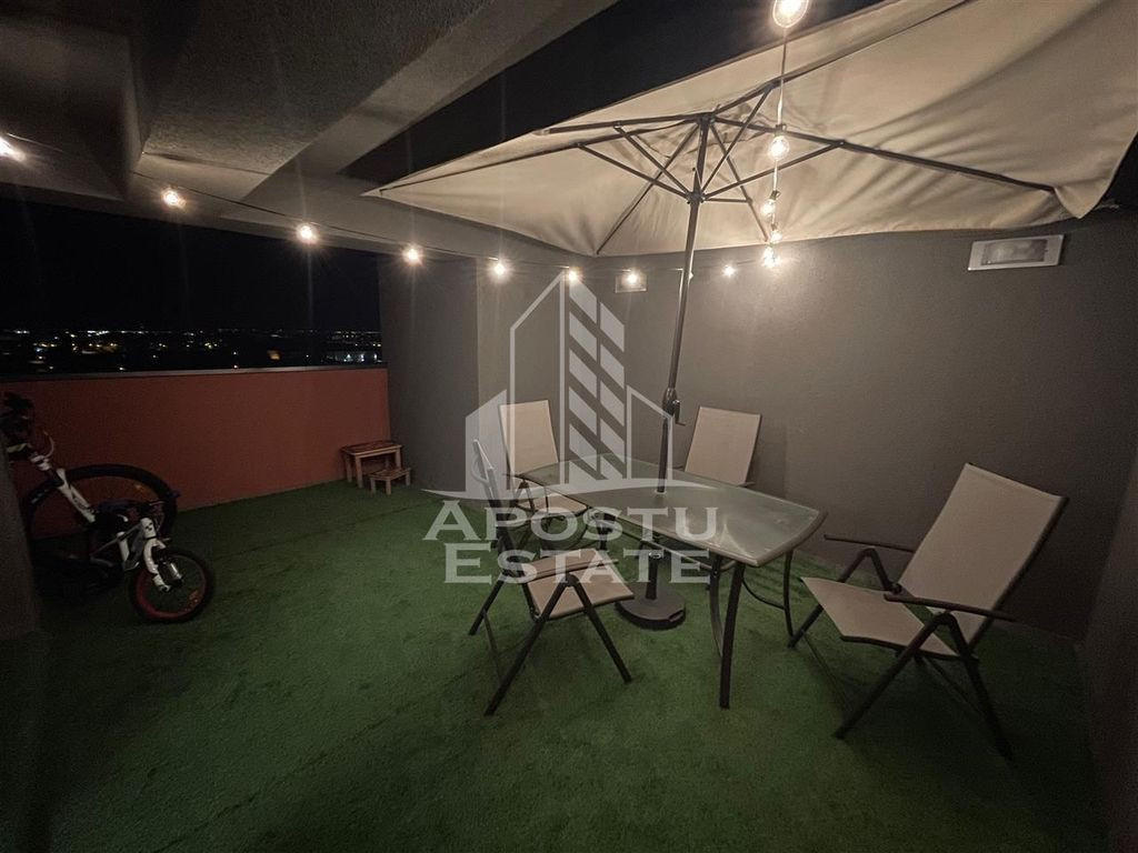 APOSTU ESTATE va ofera spre vanzare un apartament de tip penthouse premium situat in zona Calea Aradului, in apropierea British School. Proprietatea dispune de 2 camere spatioase, 2 bai moderne si o terasa spectaculoasa cu panorama asupra orasului. Apartamentul are o suprafata utila de 65 mp si beneficiaza de 35 mp de terase private, ideale pentru momente de relaxare, BBQ sau jacuzzi. Situat la etajul 11 al unui imobil modern construit in 2019, apartamentul ofera o priveliste impresionanta si se remarca prin finisaje si dotari de top. Confortul termic este asigurat de centrala proprie pe gaz, incalzire in pardoseala si doua aparate de aer conditionat. Bucataria este complet echipata Kuxa, cu electrocasnice premium: plita Bora Pure cu hota incorporata si evacuare in exterior, cuptor Bosch cu convectie, autocuratare catalitica si functie de microunde, frigider LG InstaView ThinkQ. Apartamentul dispune de alarma, tamplarie PVC cu geam tripan, usi interioare cu toc dublu si parchet de 10 mm. Se vinde complet mobilat si utilat, mobilierul fiind realizat la comanda din MDF de calitate superioara, iar coltarul este extensibil. In pret este inclus si un loc de parcare subteran. Blocul dispune de lift si este izolat exterior. Aceasta proprietate reprezinta o alegere excelenta pentru cei care isi doresc un stil de viata modern si confortabil, intr-o zona de top a orasului, cu acces facil la British School, magazine si mijloace de transport. Oferim consultanta bancara gratuita prin intermediul colaboratorilor nostri. Va asteptam cu drag la o vizionare! Disponibil imediat.