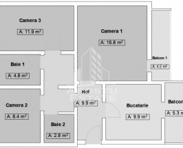Apartamentul dispune de o suprafata de 65mpu si este compartimentat astfel: