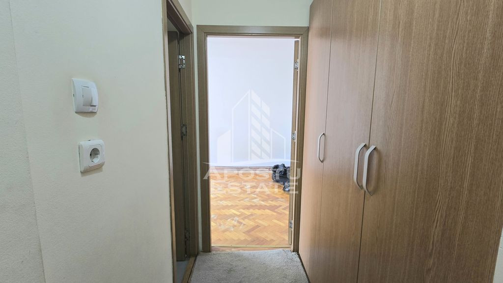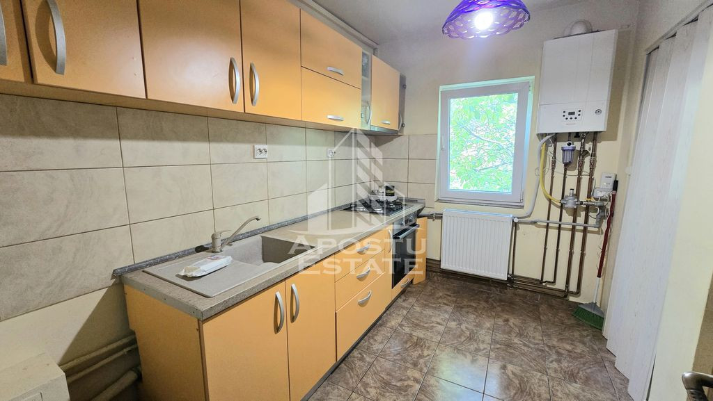 Apostu Estate va ofera spre vanzare un apartament cu 3 camere, 2 bai si 2 balcoane, situat in zona Aradului. Apartamentul se afla la etajul 4 din 4 al unui bloc izolat exterior ce beneficiaza de acoperis din tigla. Zona este linistita, apartamentul aflandu-se la cateva minute fata de market, parc, statia de autobuz sau fata de scoala si la 20 minute fata de Iulius Mall. Apartamentul are o suprafata aproximativa de 65 mp, este decomandat si compartimentat astfel: - hol de acces - bucatarie spatioasa cu loc de luat masa si camara - living spatios prevazut cu balcon - hol intermediar - dormitor - baie principala cu cada si geam pentru aerisire - dormitor prevazut cu balcon - baie de serviciu Confortul termic este realizat prin centrala proprie, dar si prin intermediul aparatului de aer conditionat. Oferim consultanta bancara prin colaboratorii nostri pentru alegerea celui mai potrivit credit. Disponibil imediat! Va asteptam cu drag la o vizionare chiar astazi!