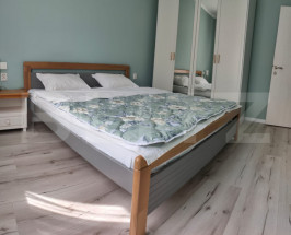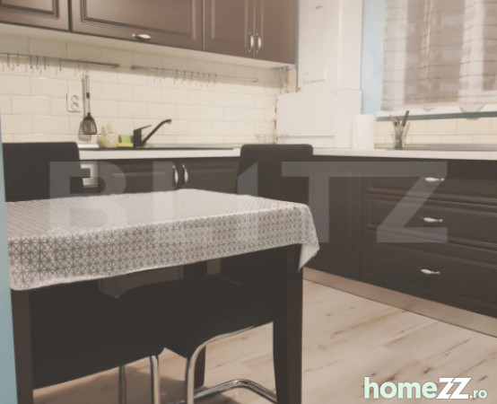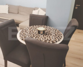 Blitz ofera spre inchiriere un spațiu care te întâmpină cu o atmosferă caldă, conturată de nuanțele plăcute de albastru deschis și tonurile neutre ale mobilierului. Canapeaua confortabilă din living, completată de perne decorative închise la culoare, creează un contrast elegant și o zonă ideală pentru odihnă sau socializare. Lumina naturală inundă camera datorită ferestrelor generoase și draperiilor moderne, iar covorul cu model geometric adaugă confort vizual și rafinament. Zona de dining este intimă și bine poziționată, cu un set de scaune căptușite ce oferă atât stil, cât și funcționalitate, perfectă pentru cine relaxate sau întâlniri cu prietenii.