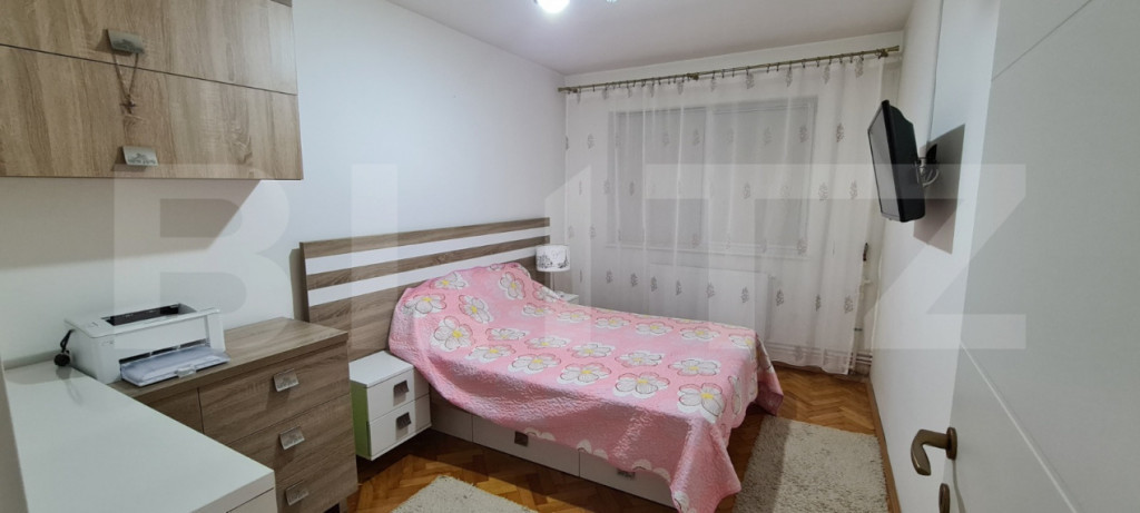Blitz va prezinta un apartament cu 3 camere, semidecomandat, situat la etajul 4 al unui bloc cu 4 etaje, într-o zonă deosebit de liniștită a cartierului Mănăștur. - Suprafață : 74 m² + balcon închis de 5 m² - Parcare exterioara disponibilă - Nu este expus la strada principală, ideal pentru cei care caută liniște și confort Apartament renovat complet de la zero: instalație termică pe cupru cu centrală termică nouă și calorifere instalație electrică refăcută profesional ușă nouă de intrare Se predă la cheie, complet mobilat și utilat, exact ca în poze. Compartimentare: - Living luminos - 2 dormitoare - Bucătărie separată - Baie cu geam - Balcon închis - 2 holuri de acces - Cămară pentru alimente/depozitare Locația este excelentă, cu acces rapid către ViVO si Centru, școli, grădinițe, parcuri, magazine și stații de autobuz. Pe langa parcarea exterioara, apartamentul dispune si de un garaj la parterul blocului la 19.999 Euro. O alegere ideală pentru o familie care caută confort, liniște și o locuință gata de mutat! Cod ofertă / ID BLITZ: P165274 Id intern: P165274