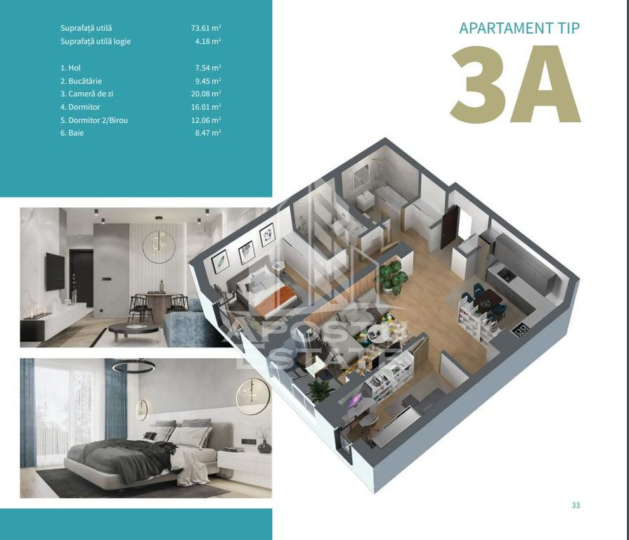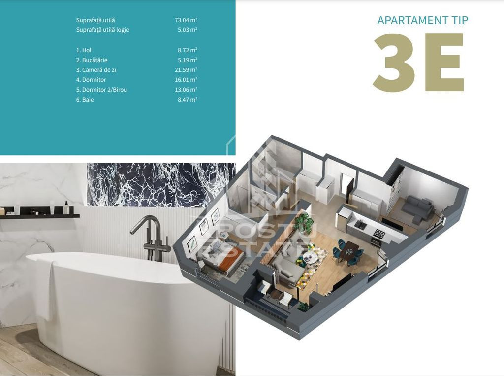 APOSTU ESTATE va propune spre vanzare un apartament cu 3 camere, situat într-un complex rezidențial de prestigiu din Timișoara. Proprietatea beneficiaza de un design modern cu finisaje de inalta calitate. Locuinta se afla intr-o zona exclusivista, cu acces facil la principalele puncte de interes ale orasului. Complexul rezidential beneficiaza de facilitati premium, cum ar fi: parcare privata subterana, parcuri si spatii de promenada, 4.000 de metri patrati de spatii comerciale, care gazduiesc supermarketuri, sali de sport, cafenele, restaurante, librării si branduri de lifestyle. Cladirea rezidentiala este dotata cu 3 centrale termice de bloc amplasate in spatiul etajului tehnic dedicat, astfel ca pentru fiecare apartament din cladire se utilizeaza cate un modul termic de apartament, destinat incalzirii si prepararii apei calde menajere. In acest complex rezidential avem disponibile urmatoarele modele de apartamente cu 3 camere: - suprafata utila de 73,61mp + logie de 4,18mp - 202.527 - 208.426 euro (3A) - suprafata utila de 73,04mp + logie de 5,03 mp - 202.824 - 204.680 (3B) In aceste preturi TVA-ul este inclus. Va asteptam cu drag la o vizionare!