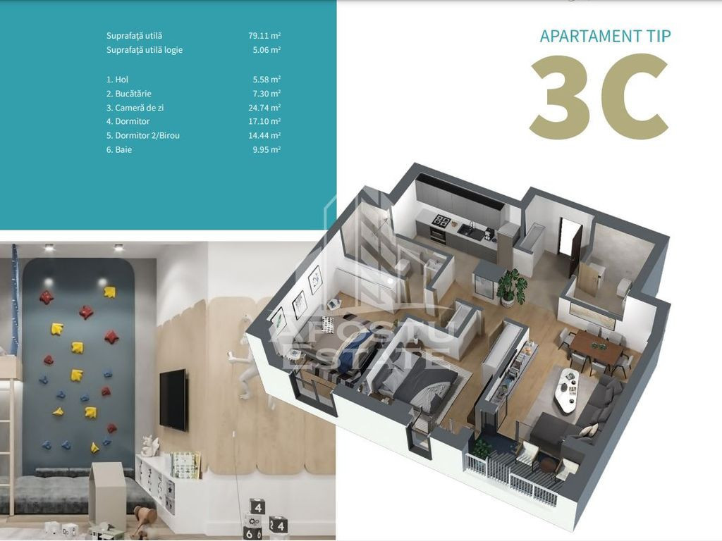 APOSTU ESTATE va propune spre vanzare un apartament cu 3 camere, situat într-un complex rezidențial de prestigiu din Timișoara. Proprietatea beneficiaza de un design modern cu finisaje de inalta calitate. Locuinta se afla intr-o zona exclusivista, cu acces facil la principalele puncte de interes ale orasului. Complexul rezidential beneficiaza de facilitati premium, cum ar fi: parcare privata subterana, parcuri si spatii de promenada, 4.000 de metri patrati de spatii comerciale, care gazduiesc supermarketuri, sali de sport, cafenele, restaurante, librării si branduri de lifestyle. Cladirea rezidentiala este dotata cu 3 centrale termice de bloc amplasate in spatiul etajului tehnic dedicat, astfel ca pentru fiecare apartament din cladire se utilizeaza cate un modul termic de apartament, destinat incalzirii si prepararii apei calde menajere. In acest complex rezidential avem disponibile urmatoarele modele de apartamente cu 3 camere: - suprafata utila de 79,11mp + logie de 5,06mp - 221.098 euro (3C) In aceste preturi TVA-ul este inclus. Va asteptam cu drag la o vizionare!