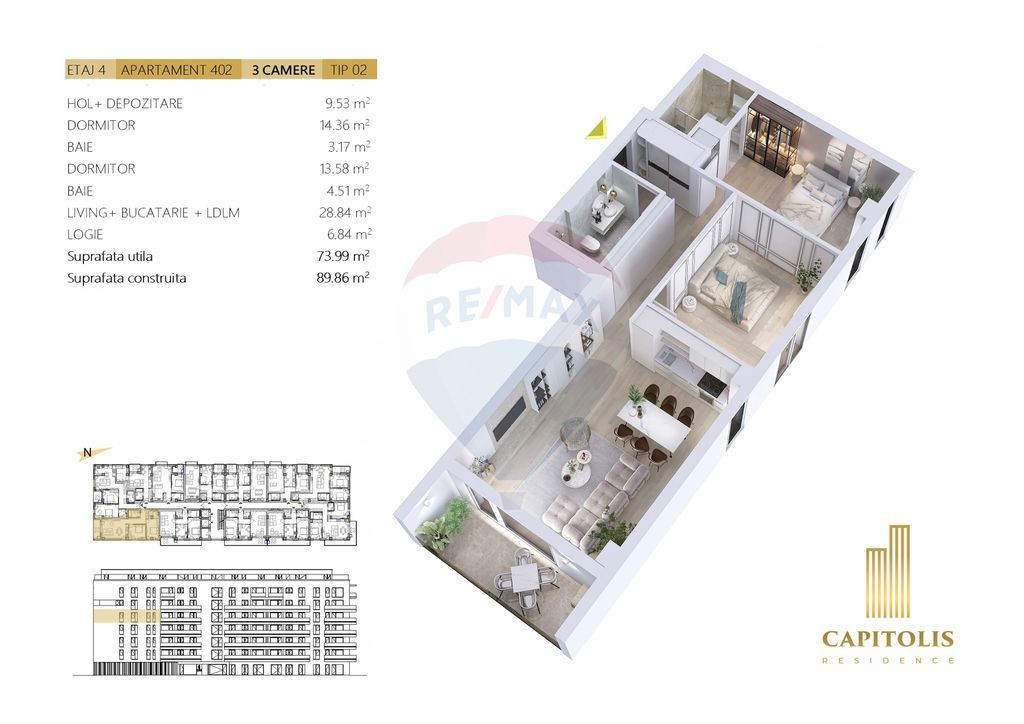 Suntem bucuroși să vă prezentăm un nou proiect rezidențial amplasat pe strada I.C. Brătianu, nr. 39, cartier Tractorul. Blocul , cu un regim de înălțime S+P+6E+7R , include 76 de apartamente ce vor fi predate la finalul anului 2026. Toate apartamentele din imobil vor beneficia de încălzire prin pardoseală și vor fi orientate către Est, Sud și Vest, pentru ca viitorii locatari să se poată bucura de o priveliște de vis prin geamurile panoramice asupra munților Tâmpa, Postăvarul, Piatra Mare, Ciucaș, Bucegi și Făgăraș. Izolatia imobilului va fi realizată cu vată minerală de 15cm pentru o eficiență termică excepțională, asigurând costuri reduse la căldură pe toată perioada iernii. Iată câteva avantaje pe care le veți găsi în acest proiect: • Spații comerciale la parter – market, farmacie, birouri • Loc de joacă pentru copii • Peisagistică creată pe 900 mp de spații verzi • Gama variată de apartamente, de la studio-uri spațioase, la apartamente de 2, 3 și 4 camere sau penthouse-uri • Arie supravegheată video • 48 de parcări subterane și 37 de parcări supraterane • Stații de încărcare pentru mașini electrice • 36 boxe de depozitare • 2 lifturi moderne • Compartimentări interioare din cărămidă • Geamuri panoramice cu 3 foi de sticlă • Finisaje premium și obiecte sanitare de calitate superioară în colaborare cu Delta Studio • Panouri fotovoltaice și panouri solare termice pentru a reduce costurile de întreținere a locatarilor. Capitolis Residence, un proiect rezidențial prietenos cu mediul, care își propune să reducă semnificativ emisiile de carbon și să minimizeze cheltuielile viitorilor proprietari. Țelul nostru este să oferim locatarilor echilibrul perfect între confort și sustenabilitate. *Prețul afișat nu include TVA și este valabil pentru plata în tranșe. **Parcare exterioară de la 10.000 euro + TVA Parcare subterană de la 15.000 euro + TVA Boxă: de la 2.100 euro/mp + TVA