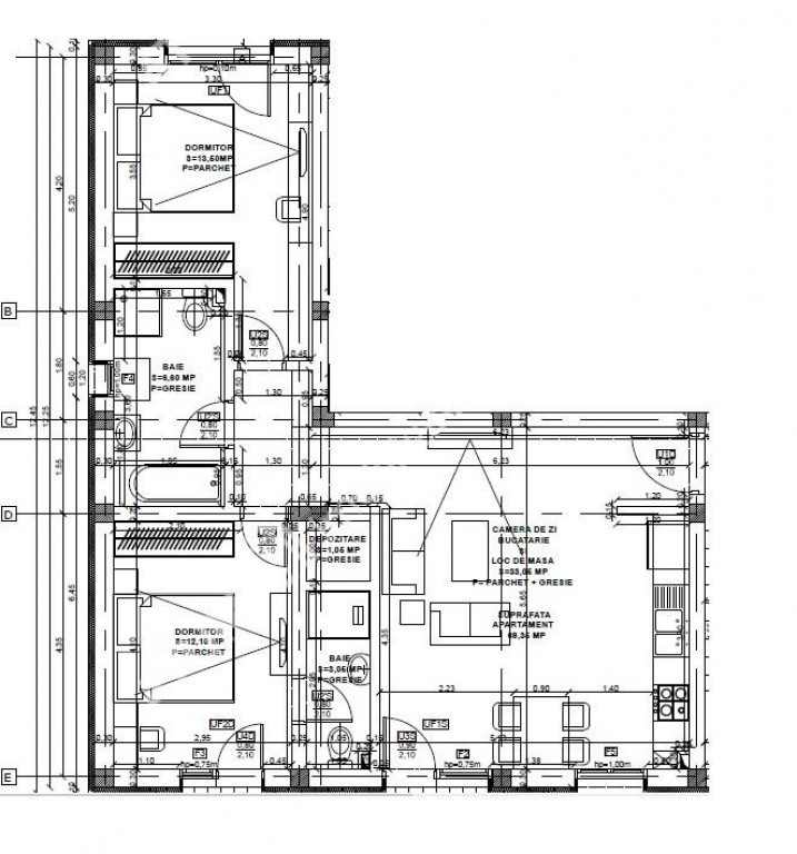 Apartamentul are suprafata utila de 69,35 mp, acesta fiind compus din camera de zi tip open space cu bucataria de 33.05 mp, cele 2 dormitoare dintre care cel matrimonial de 12.05 mp care detine si propria baie de 3.06 mp dotata cu dus, iar dormitorul secundar 13.50 mp destinat copilului sau oaspetilor, baia principala de 6.80 mp si o debara de 1.05 mp.