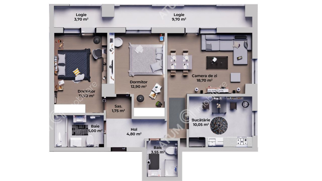 Comision 0 ! De vanzare cu 3 camere decomandate, 2 bai si 2 balcoane in suprafata totala de 91 mp in zona Calea Surii Mici, chiar la intrare dinspre cartierul Piata Cluj. Apartamentul in suprafata de 69.45 mp este compus din 2 dormitoare de 12.7 mp si respectiv 12.9 mp, livingul open-space cu bucataria de 29.55 mp care prezinta posibilitate de inchidere a bucatariei, holul de acces de 6.55 mp si 2 bai dintre care cea principala se poate dota cu cada iar cea secundata cu cabina de dus. Separat de suprafata utila se adauga si cele 2 balcoane in suprafata de 9.70 mp si respectiv 3.7 mp in care se poate face accesul atat din cele 2 dormitoare cat si din living. Apartamentul se preda la stadiul de alb si dispune de urmatoarele dotari si finisaje: -Usa de metal anti-efractie la intrarea in apartament placata cu MDF; -Pereti tencuiti ( tencuiala pe baza de var-ciment ), gletuiti si zugraviti cu lavabila alba in 2 straturi; -Pardoseli amenajate cu sapa autonivelanta semiuscata elicopterizata pregatite pentru parchet-gresie; -Tamplarie PVC marca Sallamander cu 5 camere si 3 foi de sticla cu Low-E, glafuri exterioare de aluminiu si PVC interior; -Centrala proprie pe gaz marca Bosch in condensare si incalzire in pardoseala; -Distribuitor pentru instalatia de incalzire; - Racorduri apa-canal in bucatarie si bai; - Racord gaz metan la bucatarie; -Instalatii electrice trase pe pozitie cu tablou general si sigurante pentru consumatorii de putere; -Instalatii pentru TV si internet trase pe pozitie. Optional predarea apartamentului se poate face si complet finisat la cheie cu: pardoseala placata cu parchet laminat si gresie, faianta, obiecte sanitare, usi interioare, prize si intrerupatoare intr-un buget prestabilit. Spatii comune interioare se vor preda la stadiul " la cheie " care cuprind: casa scarilor placata cu gresie anti-derapanta, balustrada de inox, pereti zugraviti cu vopsea lavabila, plafoniere cu senzor de miscare, ascensor silentios cu capacitatea de 6 persoane, acces securizat in imobil, usa de acces din PVC cu sistem de blocare electromagnetic. Valoarea apartamentului este de 132.300 euro, acesta se poate achizitiona si prin accesarea unui credit bancar. ID 2597
