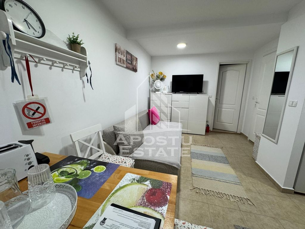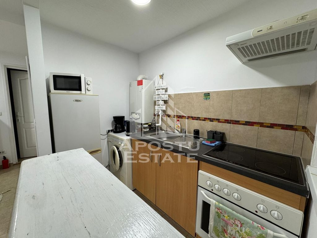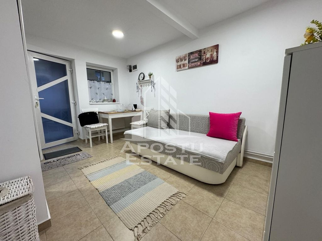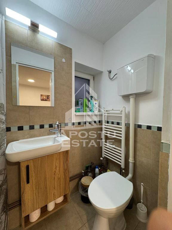 APOSTU ESTATE va propune spre inchiriere un apartament cochet si elegant, cu o camera, situat intr-o zona linistita si bine conectata din Timisoara, ideal pentru cupluri sau persoane care doresc un spatiu primitor si confortabil. Suprafata utila: 30 mp Compartimentare eficienta: Bucatarie mobilata si utilata, cu loc de luat masa Un dormitor matrimonial mobilat Living primitor care dispune de canapea extensibila Baie cu cabina de dus Terasa in fata, in curte comuna Confort si facilitati: Centrala termica proprie pe gaz Aer conditionat in dormitor Apartamentul este complet mobilat si utilat O curte comuna foarte primitoare, perfecta pentru recreere Localizare: Zona Lipovei – liniste, acces facil spre oras, in apropiere de magazine, scoli si mijloace de transport in comun. Ideal pentru: Un tanar care lucreaza de acasa Studenti Cupluri Pret chirie: 350 Euro Va asteptam la o vizionare! ID intern: CP2806566