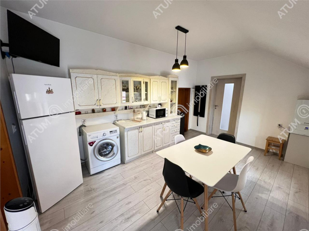 Va propunem spre vanzare un apartament cu o camera, situat la casa in zona Promenada Mall din Sibiu Locuinta are suprafata utila de 43 mp, este compartimentata eficient si dispune de o camera, o bucatarie complet amenajata si un spatiu de luat masa tip living, cu iesire pe balcon, oferind un plus de confort si functionalitate si o baie dotata cu geam de aerisire. Separat mai detine o pivnita de aproximativ 3 mp. Apartamentul detine dotari precum tamplarie PVC cu geam termopan, parchet laminat, gresie si faianta, usi interioare din lemn, cabina de dus, calorifere, centrala termica proprie marca Vaillant. Se vinde complet mobilat si utilat, fiind pregatit pentru mutare imediata, incluzand aragaz, masina de spalat rufe, frigider si televizor. O proprietate practica si accesibila, potrivita atat pentru locuit, cat si pentru inchiriere. Valoarea de achizitie este de 75.000 euro. Aceasta se poate achizitiona si prin credit bancar. ID intern: 3395.