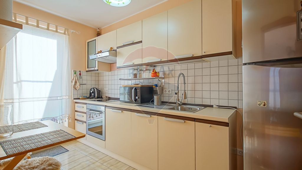 Bucătăria este complet mobilată și utilată și dispune, de asemenea, de acces către terasă. Terasa generoasă îți oferă posibilitatea de a-ți amenaja un colț de relaxare sau chiar un grătar, existând deja suport pentru prelată.