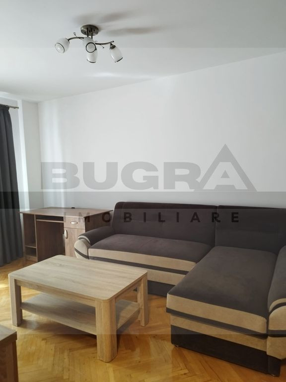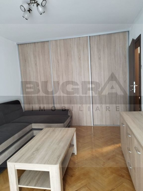 Bugra Imobiliare va ofera spre inchiriere un apartament de 2 camere, situat in cartierul Manastur, zona Bucium, in aproprierea mijloacelor de transport in comun si a magainelor. Apartamentul este pozitionat la etajul 5 intr-un imobil cu 10 niveluri si dispune de o surpfarata utila de 50mp. Compartimentarea este una decomandata si dispusa astfel: dormitor, living, bucatarie, baie, hol. Beneficiaza de centrala termica proprie si se ofera spre inchiriere complet mobilat si utilat. Disponibil imediat! Te asteptam cu drag la vizionare!