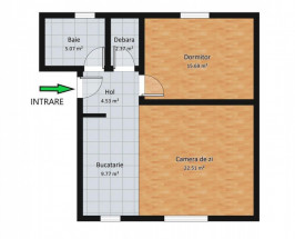Locuinta masoara 59,70 mp utili, aceasta fiind alcatuita din camera de zi tip open space cu bucatarie de 32,28 mp care ofera un spatiu generos si aerisit dar cu usurinta pot fi separate intr-un living de 22,48 mp si o bucatarie inchisa de 9,80 mp, dormitorul generos de 15,64 mp, baia de 5,03 mp dotata cu geam de aeirsire si cada, debara de 2,36 mp unde este pozitionata masina de spalat rufe dar care permite amenajarea unei bai de serviciu avand deja racorduri de apa si canalizare trase pe pozitie si un hol de 4,40 mp unde este amenajata zona de primire cu pantofar si cuier.