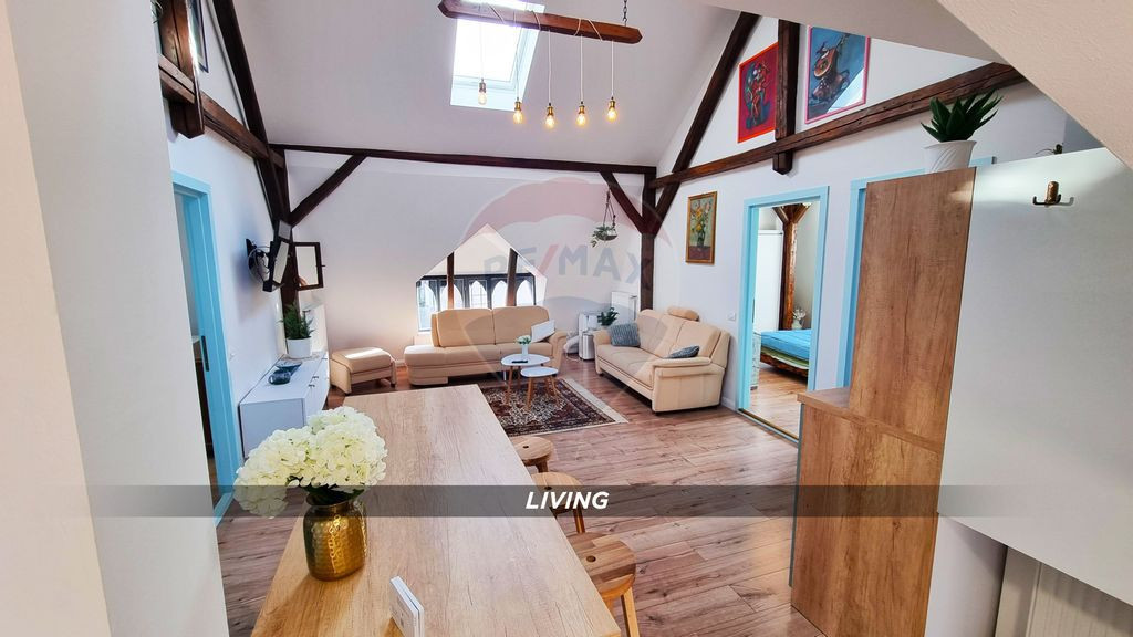 Vă propun spre închiriere un apartament deosebit complet mobilat și utilat, situat la mansarda unei case din Centrul Istoric al orașului Baia Mare. Recent renovat și amenajat într-un stil ce combină designul modern cu cel tradițional, apartamentul beneficiază de acces separat și curte. Compartimentarea este astfel: - 2 dormitoare cu 2 bai aferente; - living cu bucătărie open-space și baie de servici; - hol de acces. Ideal pentru un cuplu/familie ce apreciază spațiul, compartimentarea practică și o locație premium. Disponibil pentru închiriere din data de 3.01.2026 Chirie 600 euro + 1 garanție în valoare de 900 euro Pentru mai multe informații și vizionări, contactează-mă la nr de telefon 0757702298, Xanta Lukacsovits-consultant imobiliar RE/MAX Terra