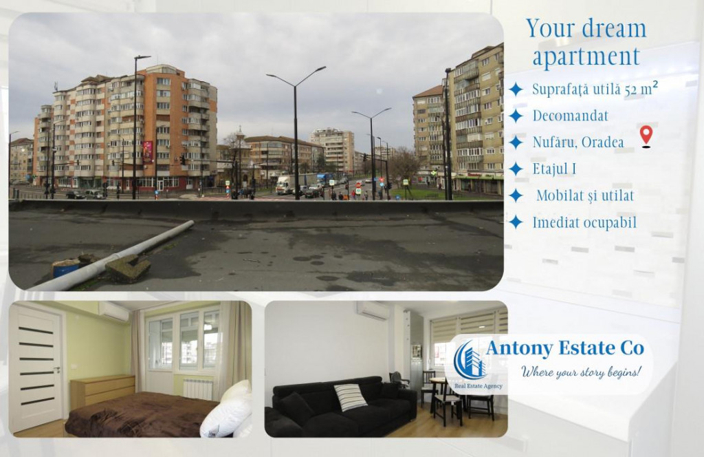 Disponibil din 1 Februarie 2026 Va propunem spre inchiriere in exclusivitate un apartament cu 3 camere, Etajul 1, mobilat si utilat, situat pe strada Nufarului , Nufaru - Oradea. Imobilul se afla intr-un bloc de apartamente cu 10 etaje, fiind situat la etajul 1 al acestuia, blocul fiind dotat cu acoperis si lift. Detine o suprafata totala de 72 mp construiti, din care suprafata utila este de 52 mp. Apartamentului i s-au adus modificari, transformandu-se intr-unul cu 3 camere. La preluarea imobilului, se percepe valoarea cumulata a unei (1) chirii lunare, ca si garantie. Pretul chiriei este usor Negociabil pentru cei care aleg plata in avans pe o perioada de 1 an. Nu se accepta animale de companie. Locuinta este compusa astfel: - 1 camera de zi; - 1 bucatarie open space; - 1 dormitor matrimonial; - 1 dormitor tineret/office; - 1 baie cu cada; - 1 dressing; - 1 debara; - 1 vestibul. Proprietarul pune la dispozitie viitorului nou chirias urmatoarele utilitati: cuptor si plita, microunde, hota, frigider, masina de spalat rufe, masina de spalat vase, uscator de rufe, 1 TV si intregul mobilier ce se vede in poze. Icirc;n apropierea acestui imobil se gasesc: loc de joaca pentru copii, statii de autobuz si tramvai, Gradinite, Scoli, Restaurante, Hoteluri, acces facil spre centrul orasului. Scara blocului este dotata cu interfon. Confortul termic al apartamentului este realizat de la reteaua edilitara de termoficare, cu , astfel costurile cu intretinerea sunt mici. Apartamentul dispune de 3 aparate aer conditionat. Informatiile tehnice au caracter orientativ, acestea fiind preluate de la proprietar. Pentru mai multe detalii si vizionari, ne puteti contacta telefonic la numarul din anunt. Antony Estate CO - Where your story begins!