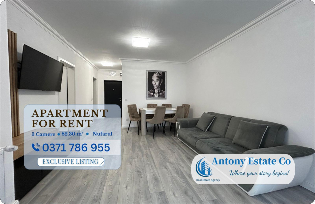COD: AA Va propunem spre inchiriere un apartament cu 3 camere, decomandat, Etajul 4 din 10, complet mobilat si utilat, situat in zona Nufarul - Oradea, in ansamblul rezidential Victoria 1. Cladirea B este dotata cu lift si interfon smart. Apartamentul detine o suprafata totala de 115.5 mp construiti, din care suprafata utila este de 82.30 mp. La preluarea imobilului, se percepe valoarea cumulata a unei (1) chirii lunare, ca si garantie. Pretul chiriei este usor negociabil pentru cei care aleg plata in avans pe o perioada de 1 an. Locuinta este compusa astfel: - 1 Living Room; - 2 Dormitoare; - 1 Bucatarie; - 2 Bai cu cabine de dus, walk-in; - 1 Vestibul generos cu dressing; - 1 Balcon deschis. Proprietarul pune la dispozitie viitorului nou chirias urmatoarele utilitati: plita cu inductie, cuptor electric, frigider, masina de spalat rufe, masina de spalat vase, cuptor cu microunde si intregul mobilier ce se vede in poze. Toate electrocasnicele sunt noi, in garantie. Apartamentul are un loc de parcare dedicat, nr. 129 Icirc;n apropierea acestui imobil se gasesc: loc de joaca pentru copii, statii de autobuz si tramvai, gradinite, scoli, restaurante, hoteluri, acces facil spre centrul/centura orasului. Confortul termic al apartamentului este realizat de la reteaua edilitara de termoficare, incalzire in pardoseala, astfel costurile cu intretinerea sunt mici. Imobilul dispune de aparat aer conditionat. Informatiile tehnice au caracter orientativ, acestea fiind preluate de la proprietar. Pentru mai multe detalii si vizionari, ne puteti contacta telefonic la numarul din anunt. Antony Estate CO - Where your story begins!