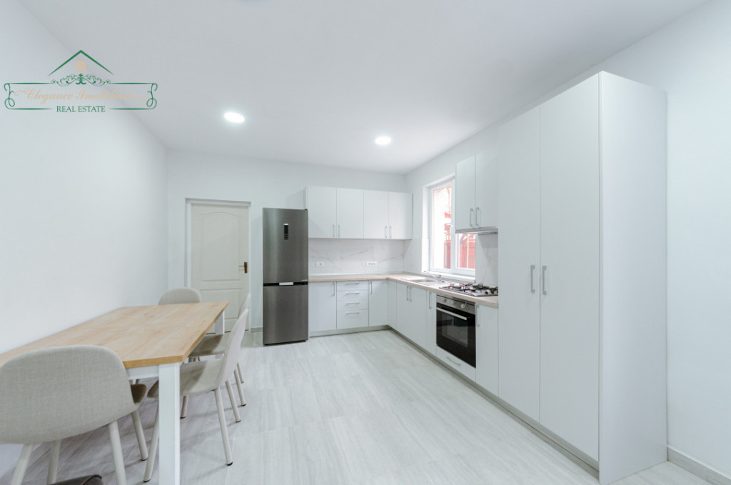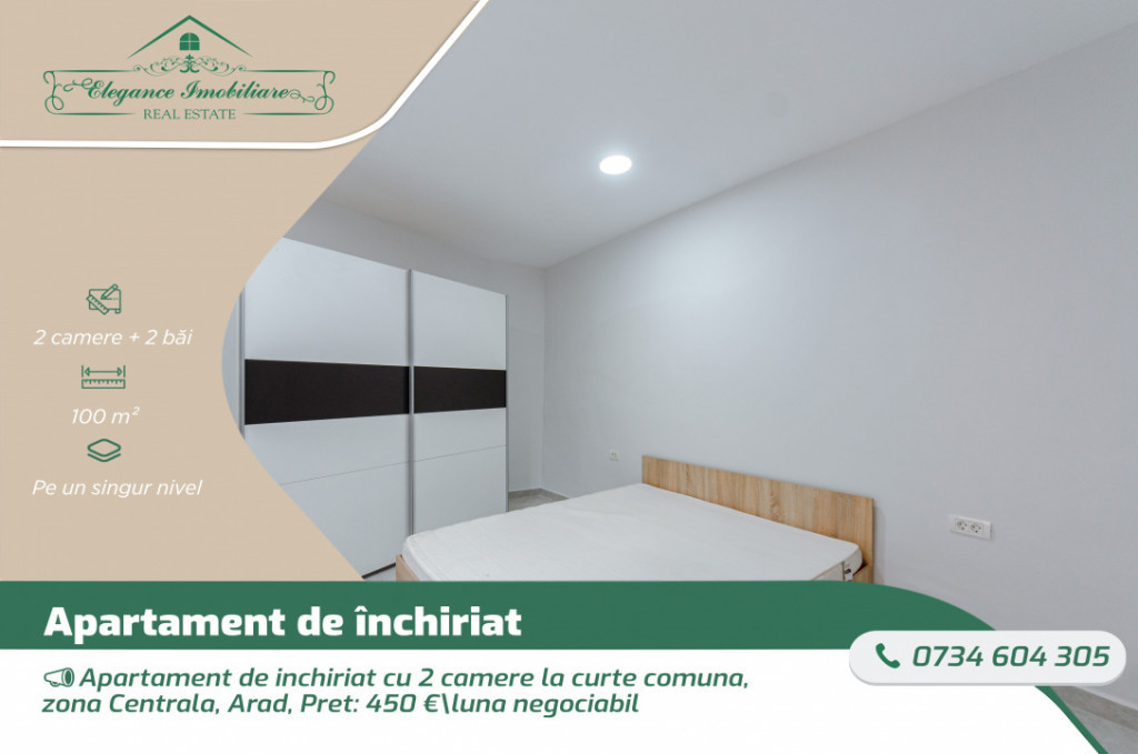 Elegance Imobiliare vă propune spre închiriere un apartament cu 2 camere situat la parter, într-o curte comună liniștită din zona Centrală a orașului Arad – o proprietate potrivită pentru cei care își doresc spațiu generos, intimitate și acces facil către toate punctele de interes. Cu o suprafață construită de 100 mp și compartimentare semidecomandată, apartamentul oferă o organizare practică și echilibrată a spațiului. A fost renovat complet în 2026 și se prezintă într-o stare foarte bună. Este compus din două dormitoare, dintre care unul se remarcă prin designul atent realizat și baia proprie, bucătărie complet mobilată și utilată, baie suplimentară și hol spațios. Un avantaj important al acestei proprietăți este grădina proprie de 110 mp, un spațiu ideal pentru relaxare, timp petrecut în aer liber sau amenajarea unei zone verzi după propriile preferințe. Fie că vă doriți un loc liniștit pentru cafeaua de dimineață sau un spațiu pentru activități în familie, această grădină adaugă un plus real de confort. Imobilul este racordat la rețeaua de apă și canalizare, rețeaua electrică și rețeaua de gaz, beneficiind de centrală proprie cu încălzire în pardoseală. De asemenea, dispune de internet și televiziune prin fibră optică. Apartamentul se închiriază complet mobilat și utilat, fiind pregătit pentru mutare imediată. Poziționarea în zona Centrală asigură acces rapid către zone verzi, spații de joacă, grădinițe, școli, licee, magazine, supermarketuri, mijloace de transport în comun, bănci și numeroase alte facilități urbane. Această proprietate îmbină spațiul generos, funcționalitatea și avantajul unei grădini proprii, oferind un cadru plăcut și practic pentru locuire. Prețul de închiriere al acestui imobil este de 450\luna euro, negociabil. Pentru mai multe detalii și pentru o vizionare personalizată, contactează-ne la numărul de telefon 0734.604.305. Elegance Imobiliare - partenerul tău de încredere în domeniul imobiliar! Id intern: P241420