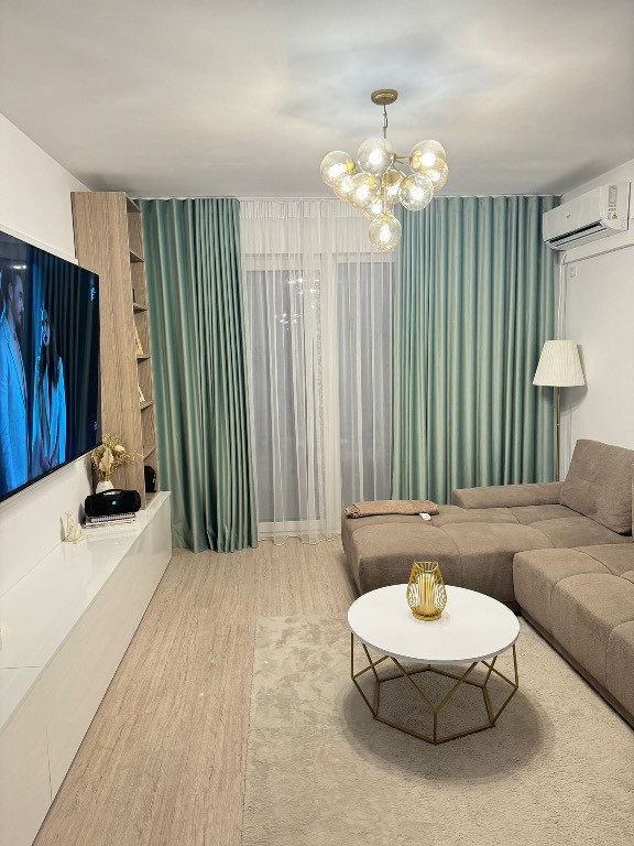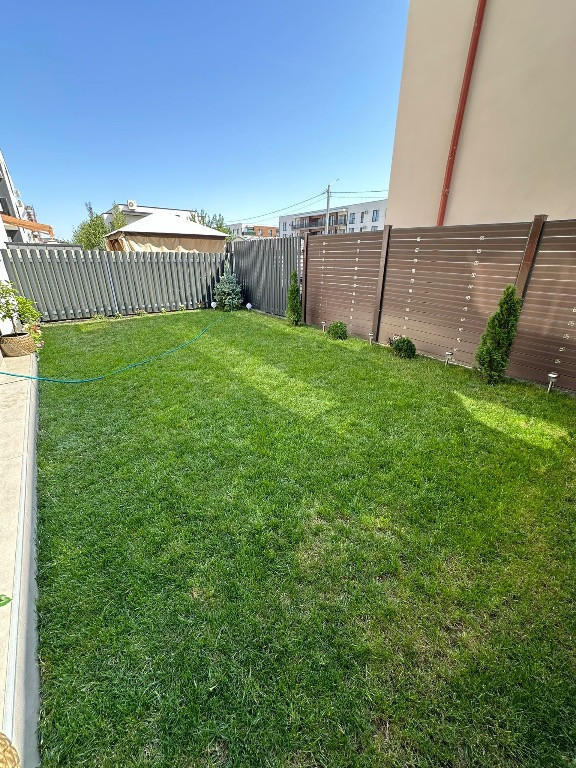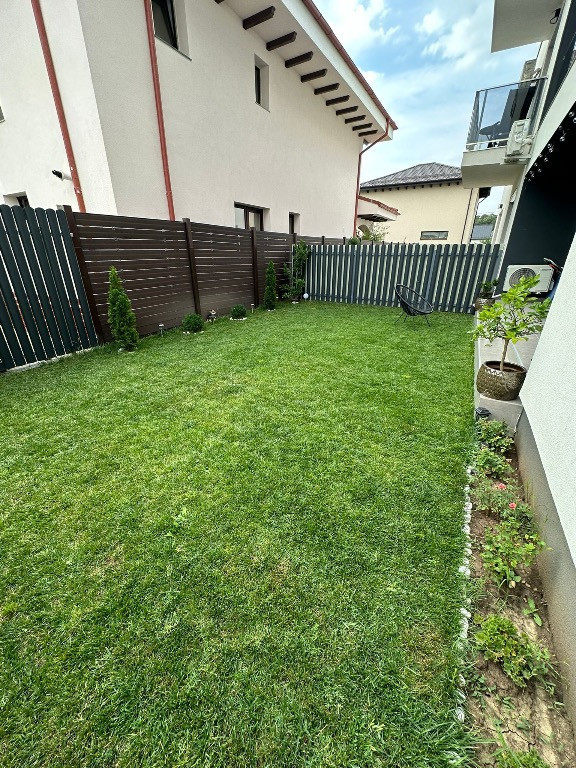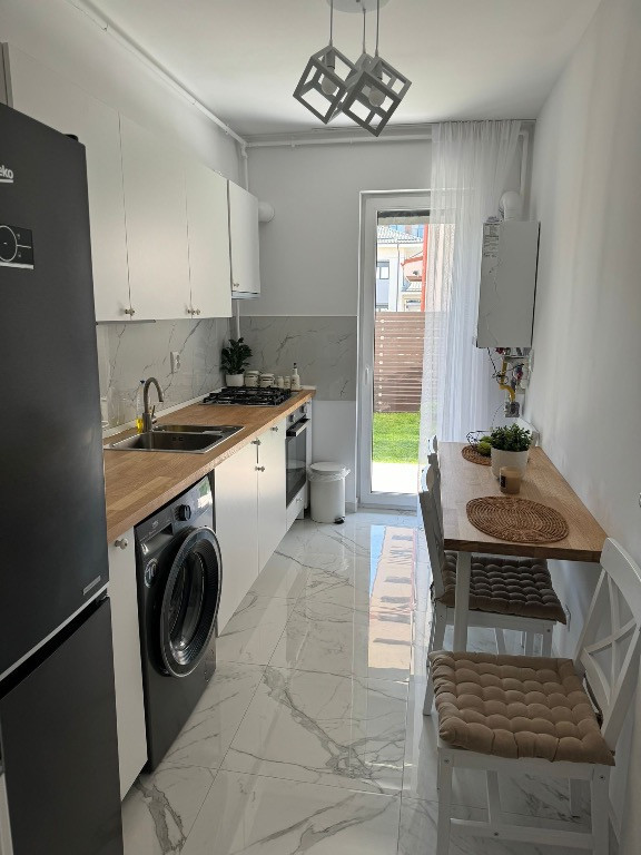 Ofer spre inchiriere apartament nou, complex nou de blocuri, inaltime de 2 etaje. Intrare privata, bariera, departe de agitatia de pe soseaua 1 Decembrie. Complet utilat si mobilat, totul nou. Gradina superb amenajata si spatioasă (60 mp)