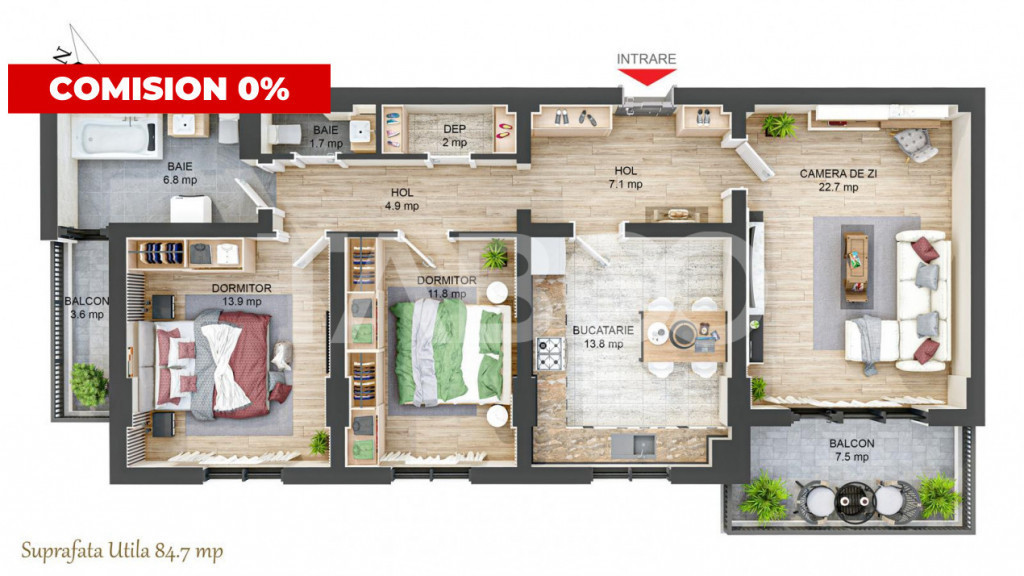 Comision 0% OCAZIE UNICA!! Hai sa iti prezentam un apartament mai mult decat spatios de 85 mp utili, la etajul intermediar 1 in Ansamblu Nou 2024 care te va incanta cu siguranta!! De vanzare apartament de 85 mp utili cu 3 camere 2 balcoane si 2 bai intr-un imobil CONSTRUCTIE NOUA 2024 la parterul inalt al unui imobil nou, in imediata apropiere de Shopping City Selimbar, Lidl, Mega Image, Kaufland, PennyMarket, unitati de invatamant, farmacii si la doar 10 minute de mers pe jos de Parcul Sub Arini. Cu o suprafata utila de 85 mp acest apartament este bine compartimentat si total decomandat astfel: 1 living generos de 23 mp cu suprafete vitrate mari cu iesire pe balconul de 8 mp, 1 bucatarie inchisa de 14 mp, 1 dormitor matrimonial de 14 mp foarte luminos, 1 dormitor de 12 mp, 1 baie de 7 mp cu geam de aerisire si un balcon retras de 4 mp, 1 baie de serviciu de 2 mp, 1 hol spatios de 12 mp la intrare care face ca locuinta sa fie decomandata. Noul imobil are regimul de inaltime S+P+4 etaje si este construit pe structura de cadre din beton si caramida in anul 2024 avand izolatii exterioare din polistiren AustroTherm EPS 80. Apartamentul se va preda la stadiul de ALB sau finisat la CHEIE in septembrie 2024 cu imbunatatiri precum: pereti gletuiti si zugraviti cu lavabila alba, usa intrare metal Porta Doors, centrala termica de imobil si calorifere de otel cu repartitor, racordare la toate utilitatile ( apa, canalizare, gaz, curent, fibra optica, catv ), geamuri termopan din tamplarie PVC Salamander gri-antracit 6 camere si 3 foi de sticla si pervaze din aluminiu la exterior. In pretul apartamentului nu este inclus locul de parcare privat ( acesta putand fi achizitionat contra cost in limita locurilor disponibile atat in PARCAREA SUBTERANA cat si SUPRATERANA ) inscriptionat cu numarul apartamentului. Complexul unde se afla acest apartament este gandit in asa fel incat sa iesi din cotidianul zilnic, cu o suprafata generoasa de spatii verzi foarte frumos amenajate, loc de joaca special amenajat pentru cei mici, iar pentru confortul si siguranta dumneavoastra intreg complexul beneficiaza de sistem de supraveghere video 24/24 h. Pentru acest apartament exista posibilitatea de predare la "CHEIE" la cererea dumneavoastra avand costuri aferente. Pret: 163.000€ Cod ofertă / ID: P20693 Sună-ne acum la 0369.822.820 și află detalii despre această proprietate de vanzare din Sibiu, dar și despre alte proprietăți potrivite pentru tine. Informatii speciale: 1. Descarcă aplicația pe mobilul tau "TABOO Imobiliare" din Apple Store, Google Play sau Huawei AppGallery pentru a afla instantaneu noile proprietăți care intră pe piață. 2. Dacă ai o proprietate pe care vrei să o vinzi sau să o închiriezi, suntem aici pentru tine! Contactează-ne pentru o evaluare gratuită fără obligații și vei descoperi avantajele de a lucra cu o echipă dedicată și experimentată. 3. Dacă vrei sa incepi o cariera de agent imobiliar, suna la 0369.822.820 si programeaza o intalnire pentru a afla toate beneficiile si avantajele. Intră pe TABOO.ro și descoperă cele mai recente oferte, actualizate zilnic. Anunt actualizat in 5 decembrie 2025. Id intern: P20693