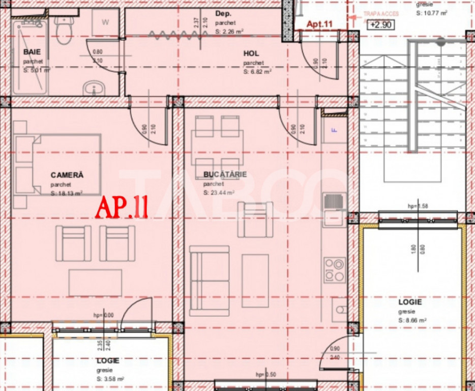 COMISION 0, apartament 2 camere de vanzare, decomandat, 52 mp, zona Selimbar, Sibiu. Avantaje majore ale acestui apartament: • Un loc de parcare inclus in pret; • Posibilitate achizitionare loc de parcare extra; • Locatie ferita de aglomeratie; • 2 logii; • Geam la baie; • Orientare sudica. TABOO Imobiliare propune un apartament de vanzare cu 2 camere, decomandat, situat in localitatea Sibiu, zona Selimbar, aflat la etajul 2 intr -un imobil tip bloc cu regim de inaltime pe Parter + 2 Etaje; anul constructiei 2024, structura beton. Suprafata utila de 52 mp + 2 logii de 8 mp, respectiv 4 mp. Apartamentul este structurat astfel: • Hol; • Bucatarie cu living + logie; • Baie; • Dormitor cu logie. Finisajele interioare sunt moderne: • Usa intrare: metal; • Usi interioare: celulare; • Tamplarie ferestre: pvc, termopan; • Pereti: vopsea lavabila, faianta; • Podele: parchet, gresie. Utilitati si dotari: • Bucatarie: neutilata, nemobilata; • Mobilat: nemobilat; • Utilitati: curent electric, apa, canalizare, gaz, acces internet; • Izolatii: exterior, bloc izolat termic; • Contorizare: apometre, contor gaz, contor curent electric; • Caracteristici bloc: interfon. Apartamentul se vinde nemobilat si neutilat. Incalzirea se realizeaza prin centrala proprie, calorifere. Se accepta ca si modalitate de plata surse proprii sau credit bancar. Pret: 125.000€ Cod ofertă / ID: P22988 Sună-ne acum la 0369.822.820 și află detalii despre această proprietate de vanzare din Sibiu, dar și despre alte proprietăți potrivite pentru tine. Informatii speciale: 1. Descarcă aplicația pe mobilul tau "TABOO Imobiliare" din Apple Store, Google Play sau Huawei AppGallery pentru a afla instantaneu noile proprietăți care intră pe piață. 2. Dacă ai o proprietate pe care vrei să o vinzi sau să o închiriezi, suntem aici pentru tine! Contactează-ne pentru o evaluare gratuită fără obligații și vei descoperi avantajele de a lucra cu o echipă dedicată și experimentată. 3. Dacă vrei sa incepi o cariera de agent imobiliar, suna la 0369.822.820 si programeaza o intalnire pentru a afla toate beneficiile si avantajele. Intră pe TABOO.ro și descoperă cele mai recente oferte, actualizate zilnic. Anunt actualizat in 5 decembrie 2025. Id intern: P22988