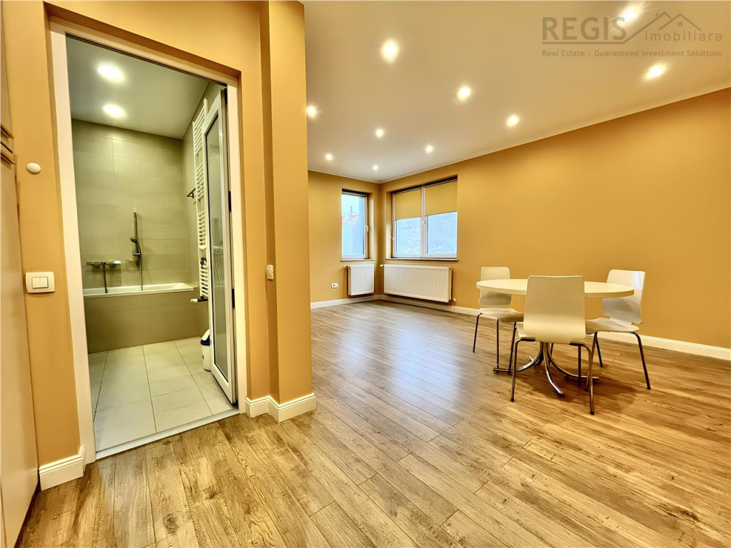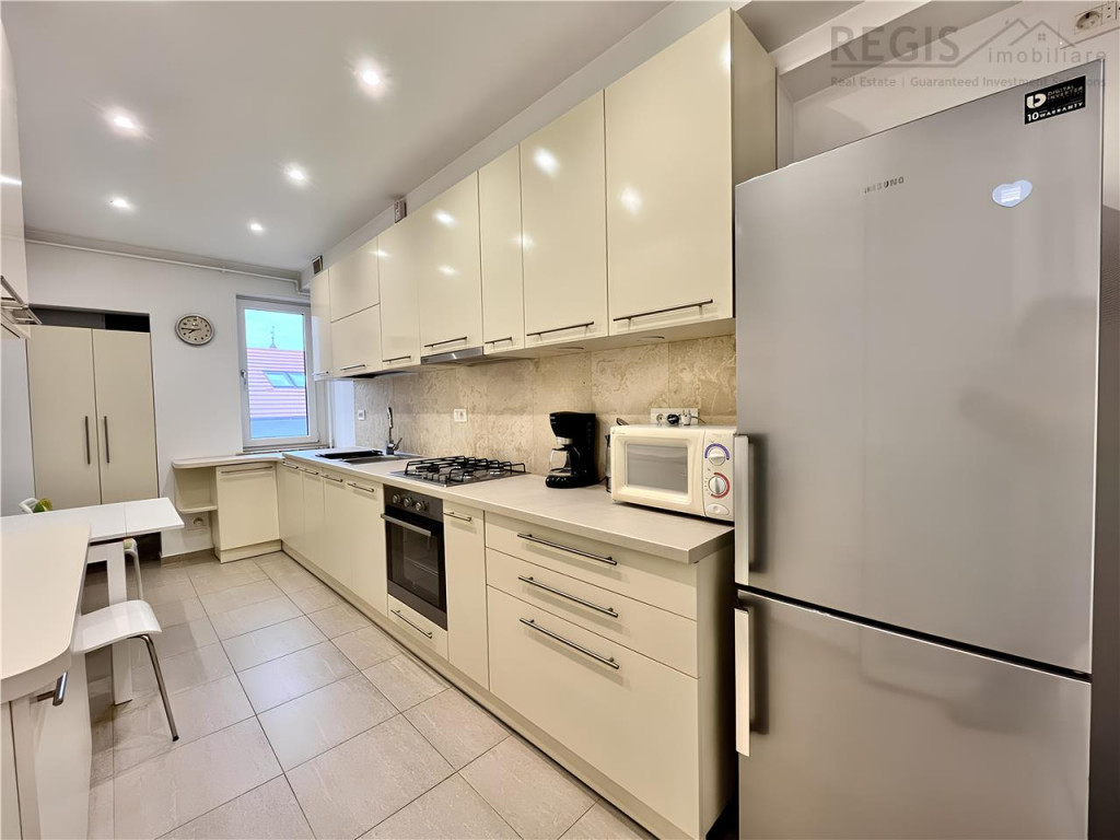 ID intern: 6014 REGIS Imobiliare va propune spre inchiriere un apartament cu 3 camere intr-o zona centrala. Acesta se afla intre primarie si aula universitatii, paralel cu Lidl, pe str. Alexandru Ioan Cuza 6. Accesul se face printr-o curte interioara unde se poate parca. (pozele 14, 15 si 16) Detalii: - Suprafata 98 mp utili - 3 camere cu 2 bai - Etajul 2/4 - Centrala proprie - Posibilitate de parcare in curte si la Lidl Compartimentare decomandata: - 3 camere, bucatarie, hol, 2 bai si balcon - o baie are cada si cealalta dus (pozele 11, 12 si 13) Utilat cu: - plita, cuptor, cuptor cu microunde, hota, frigider si aparat de cafea Zona: - Hotel Ambient (150 m) - Intre Primarie si Aula Universitatii Transilvania (600 m) - Statie autobuz Iuliu Maniu (in fata blocului) - Mall AFI (1 km) - Supermarket Lidl (150 m) - Exim Banca Romaneasca (450 m) - Easy Box (300 m) Inchirierea se realizeaza prin plata de 1 luna chirie, 1 luna garantie si comision agentie. Comisionul este 50% TVA din valoarea chiriei pe o singura luna. Va astept cu drag la vizionare!