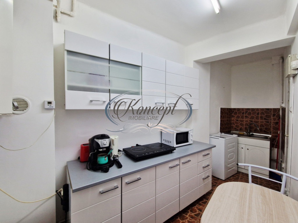 Koncept Imobiliare va ofera spre inchiriere un apartament cu o camera decomandata, situat pe strada Horea, in apropierea Facultatii de Litere, intr-o zona centrala apreciata pentru accesibilitate si proximitatea fata de principalele universitati, mijloace de transport in comun si puncte de interes din Cluj-Napoca. Apartamentul este amplasat la parter inalt al unui imobil dispus pe 5 niveluri, construit in jurul anului 1960 si dotat cu lift. Locuinta are o suprafata utila de 29,35 mp si beneficiaza de o compartimentare practica, cu hol de acces, bucatarie separata, camera si baie cu ventilatie. Orientarea estica ofera lumina naturala placuta in prima parte a zilei si contribuie la un ambient confortabil. Proprietatea a fost renovata in anul 2025 si este dotata cu centrala termica proprie cu incalzire prin calorifere, asigurand un control eficient al consumului si al temperaturii interioare. Tamplaria este din PVC cu geam termopan, iar accesul in apartament se face prin usa din PVC. Apartamentul se inchiriaza mobilat si utilat cu plita electrica, cuptor cu microunde, cafetiera, frigider si masina de spalat haine, fiind pregatit pentru mutare imediata. Pozitionarea pe strada Horea reprezinta un avantaj important, oferind acces rapid catre centrul orasului, universitati, statii de transport in comun, magazine si alte facilitati urbane. De asemenea, exista posibilitate de parcare in zona. Prin amplasarea centrala, renovarea recenta si compartimentarea eficienta, aceasta proprietate reprezinta o optiune potrivita atat pentru studenti, cat si pentru persoane active care isi doresc acces rapid catre zona centrala si catre principalele puncte de interes ale orasului. Pentru informatii suplimentare, programarea unei vizionari sau pentru a afla oferta noastra completa va stam la dispozitie telefonic, prin e-mail sau la sediul agentiei noastre, pe str. Aviator Badescu, nr. 19, Cluj-Napoca. Id intern: P21221