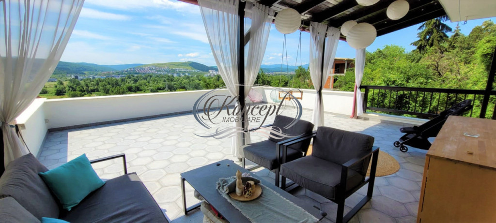 Koncept Imobiliare va ofera spre vanzare apartament cu 3 camere situat in complexul rezidential American Village, pe strada Donath, in continuarea cartierului Grigorescu din Cluj-Napoca, intr-o zona aerisita, cu acces facil catre oras. Proprietatea este amplasata la etajul 3 al unui imobil construit in anul 2008, intr-un ansamblu apreciat pentru comunitatea selecta de familii si pentru facilitatile dedicate exclusiv locatarilor. Apartamentul are o suprafata utila generoasa de 100 mp si este compartimentat eficient in living open-space cu bucataria, 2 dormitoare, dintre care unul beneficiaza de dressing si baie proprie, inca o baie, dressing separat, spatiu tehnic, camara de alimente si hol. Punctul forte al proprietatii este terasa de aproximativ 50 mp, partial acoperita, cu orientare sud-vest si panorama deosebita spre oras, ideala pentru relaxare, zona de dining exterior sau petrecerea timpului in aer liber. Locuinta dispune de finisaje moderne, incalzire in pardoseala pentru un confort termic superior si se vinde complet mobilata si utilata, fiind pregatita pentru mutare imediata. Pretul include un loc de parcare exterior, iar complexul beneficiaza de supraveghere video, oferind un plus de siguranta. American Village se remarca prin facilitati rare pe piata rezidentiala din Cluj-Napoca: piscina exterioara, curte comuna amenajata, parc de joaca si sala de hobby, toate cu acces exclusiv pentru locatari. Atmosfera este una linistita, orientata spre familie, iar accesul catre centrul orasului si catre principalele puncte de interes este rapid si facil. Datorita suprafetei generoase, terasei spectaculoase si facilitatilor din cadrul complexului, proprietatea se potriveste perfect unei familii care isi doreste confort, intimitate si un stil de viata echilibrat, dar si unei investitii premium, intr-o zona cu reputatie buna si cerere constanta. Pentru informatii suplimentare, programarea unei vizionari sau pentru a afla oferta noastra completa va stam la dispozitie telefonic, prin e-mail sau la sediul agentiei noastre, pe str. Aviator Badescu, nr. 19, Cluj-Napoca. Id intern: P21186