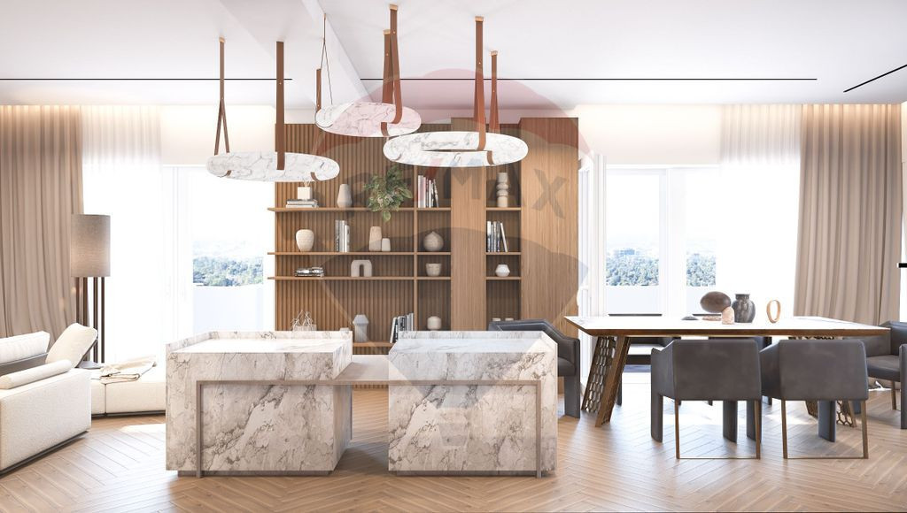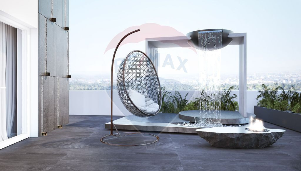 Un apartament absolut deosebit isi asteapta viitorul proprietar. Are o configuratie de 5 camere tip duplex, cu scara interioara, este situat la etajele superioare (4+5) ale unui bloc boutique cu doar 13 apartamente si este compartimentat dupa cum urmeaza: La nivelul inferior avem o zona de zi spatioasa de 45.5 mp, compusa din living, dining si bucatarie deschisa cu acces triplu catre cea mai mare terasa a apartamentului (45.8 mp), un dormitor cu terasa proprie, baie, hol cu dessing foarte spatios si o camera mai mica (ce poate fi folosita conform nevoilor viitorului proprietar ca birou, dormitor suplimentar, sala de sport sau spatiu de joaca). Accesul catre terasa mare a fost gandit foarte practic, astfel incat aceasta se poate accesa din oricare parte a zona de zi. Acest lucru creeaza o unitate perfecta a spatiului interior cu exteriorul pe timpul perioadei calde si ofera eleganta si confort. La nivelul superior avem 3 dormitoare: o suita matrimoniala de aproape 41 mp cu baie proprie si dressing imens si acces catre terasa proprie de aproape 20 mp, un al doilea dormitor de aproape 18 mp si unul mai mic, de 15 mp care poate fi poate fi o camera ideala pentru copii, fiind situat pe partea boltita a tavanului foarte inalt. In punctul cel mai inalt tavanul are 3.5m inatime, spatiul fiind unic din acest punct de vedere. S-a dorit obtinerea unor incinte non standard, care sa satisfaca nevoile acelor clienti care vor sa iasa din norme si sa aiba o casa unicat. Tot aici la nivelul superior mai avem si o baie secundara. Imaginile sunt cu titlu de prezentare, pentru a va putea face o idee mai clara despre cum este dispus spatiul si cum ar putea fi amenajat. Pretul afisat este pentru spatiul nefinisat. Dezvoltatorul a preferat sa lase libere imaginatia si preferintele viitorului proprietar, pentru a putea adapta spatiul nevoilor sale, existand posibilitatea atat a schimbarii complete a designului interior, cat si a reconfigurarii complete a interioarelor. De exemplu, spatiul de la nivelul inferior poate fi reconfigurat cu bucatarie deschisa in stil insula, iar baia care acum este in mijlocul spatiului si fragmenteaza deschiderea catre terasa poate fi mutata in camera cea mica. De asemenea, in proiectul prezentat ca exemplu s-a renuntat la dormitorul cel mic de la nivelul superiror pentru a avea un dressing foarte mare care sa deserveasca dormitorul al doilea. Sunt mai multe variante in care spatiul poate fi reconfigurat, ceea ce ofera posibilitatea cumparatorului sa adapteze spatiul perfect dupa gusturile proprii. Desigur, proiectul afisat exista si poate fi contractat suplimentar, daca va veti indragosti de ce a gandit arhitectul care s-a ocupat de design. Apartamentul beneficiaza de curent trifazic, usa de intrare blindata MAESTRO Italia si este izolat fonic atat in pardoseli, cat si in pereti si plansee. Structura de rezistenta este din beton armat in sistem de cadre, peretii exteriori din caramida Porotherm de 24 cm, peretii de separatie dintre apartamente din caramida Porotherm de 12 cm, iar fatada este izolata cu termosistem de 10 cm. La pretul afisat se dauga TVA. Sunt incluse in pret doua locuri de parcare in subteran plus o boxa pentru depozitare. Zona este in continua dezvoltare, in imediata vecinatate deschizandu-se de curand cea mai mare plaja urbana din Europa, Lagoon Park. Scola germana este, de asemenea, foarte aproape. Este un loc preferat de cei care isi doresc sa locuiasca in nordul orasului, avand acces facil catre cele doua aeroporturi si iesirea din oras catre munte. In zona sunt mai multe restaurante cunoscute, unitati medicale, cluburi de fitness, magazine, LIDL fiind la 5 minute de mers pe jos. Zona este conectata cu restul orasului prin liniile de autobuz 112, 149, 205 si 261. Pentru mai multe detalii si stabilirea unei vizionari va stau la dispozitie.