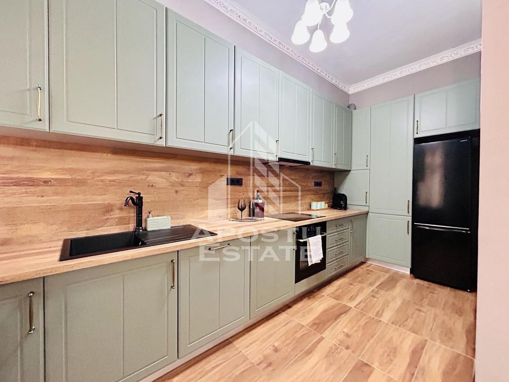 Apostu Estate va propune spre vanzare apartament exclusivist cu o suprafata de 75 mp plus un balcon inchis in Piata Maria. Este situat intr-o cladire istorica in curs de reabilitare cu regim de inaltime D+P+2 in stilul arhitectural Art Nouveau/Secession. Apartamentul este situat la etajul 1 al cladirii. A fost recent renovat complet de la rosu, incluzand instalatia electrica, sanitara, de incalzire etc. , niciun aspect nefiind neglijat. Toate lucrarile s-au efectuat asumat fara rabat la calitate, nealterand spiritul istoric al cladirii.Usile interioare au ramas cele originale, au fost atent reabilitate dand o nota si un ambient deosebit. Apartamentul ofera o suprafata utila de 75 mp + balcon si este compus din 2 camere spatioas, bucatarie si baie cu geam pentru aerisire. Bucataria luminata natural, situata central, amenajata intr-o maniera simpla, aerisita, totodata practica si functionala. Mobilierul efectuat la comanda cu linia de aparate electrocasnice de lux, aleasa din gama vintage completandu-se perfect cu ambientul locuintei unde predomina ziduri groase si usi inalte din lemn. Toate piesele de mobilier sunt alese cu o o intreaga atentie, multe dintre ele fiind din lemn masiv reconditionat. Cele doua candelabre lucrate manual pun armonios in lumina decorul si arhitectura camerelor. Incalzirea apartamentului se realizeaza prin intermediul centralei proprii pe gaz. Se vinde complet mobilat si utilat precum se poate vedea in poze. Va asteptam cu drag la vizionare!