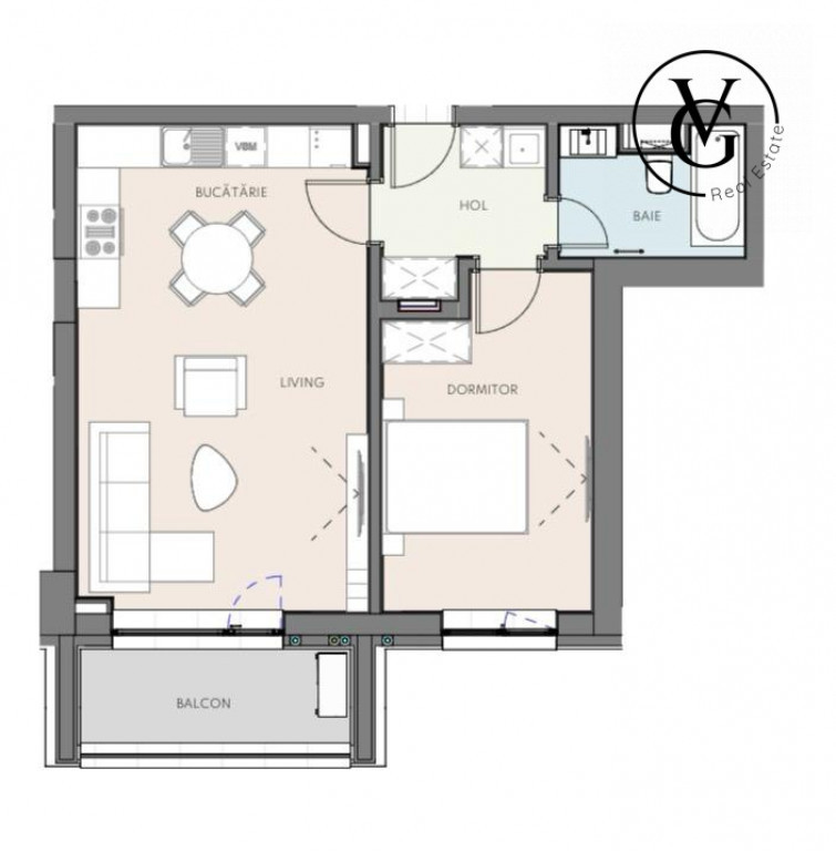 : bucătărie+ living 28.2mp, dormitor 13.7mp, baie 4.6mp, hol 5.1mp, balcon 5.5mp