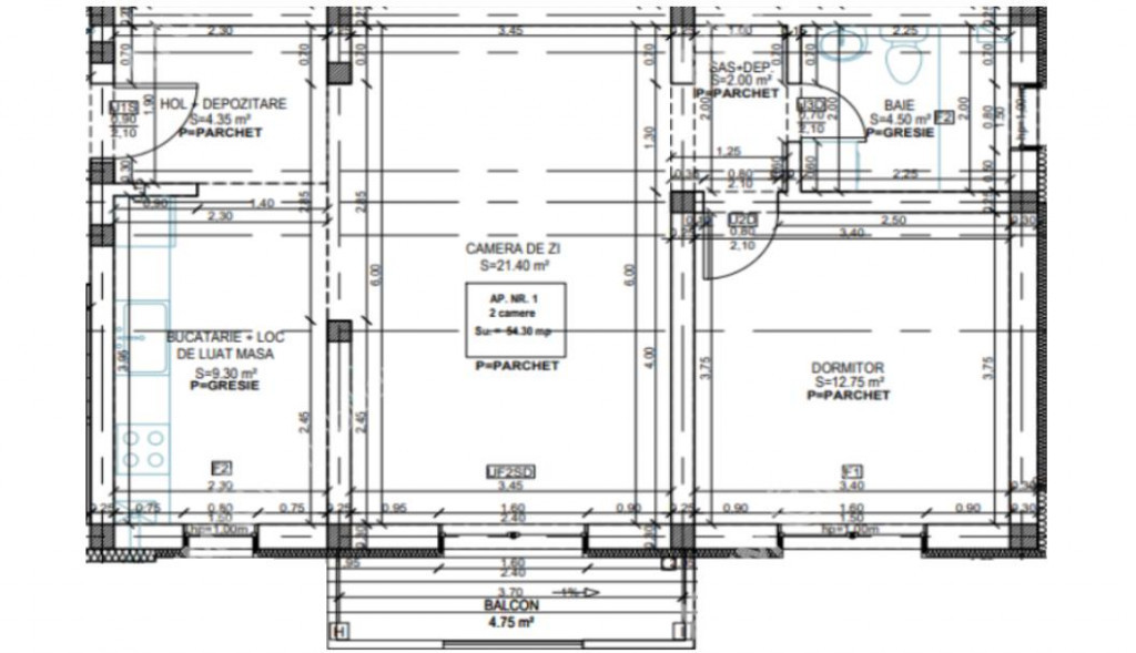 Comision 0! Apartament de vanzare in Localitatea Talmaciu, cu suprafata utila de 54.30 mp, pozitionata la etajul 1 al unui imobil constructie noua anul 2024, compus din Parter 3Etaje M ce beneficiaza de locuri private de parcare. Locuinta are suprafata de 54.30 mp utili si este compusa din camera de zi de 21,40 mp, dormitor de 12.75 mp, bucatarie de 9.30 mp cu loc de luat masa, hol cu spatiu pentru pantofar si cuier de 4.35 mp, baia de 4.50 mp si sas de 2 mp. Separat de suprafata utila, apartamentul dispune de un balcon in suprafata de 4.75 mp in care accesul se face din camera de zi. In pretul de achizitie este inclus si locul de parcare care se afla amenajat, delimitat si amplasat in fata imobilului. Locuinta se preda la stadiul de alb beneficiind de urmatoarele dotari: - Usa de metal la intrarea icirc;n apartamente; - Pereti tencuiti ( tencuieli pe baza de var-ciment ), gletuiti si zugraviti in lavabila alba; - tamplarie PVC cu 5 camere si 3 foi de sticla; - incalzire prin pardoseala, centrala termica proprie in condensatie si detector gaz; - sisteme elecrice din cupru si sigurante pentru consumatorii de putere; - Instalatii pentru curentii slabi Internet, Telefon, TV; - Racorduri apa-canal in bucatarie si bai; - Racord gaz metan la bucatarie; - Instalatii pentru gaz, curent electric si apa, contorizare individuala si contoare montate. Imobilul in care se afla locuinta este edificat pe structura de cadre din beton si caramida de 30 cm izolata cu polistiren de 10 cm cu densitatea EPS80 si zugravit cu decorativa siloconata colorata in masa de exterior. Casa scarii dispune de: lift, acces securizat, scari placate cu granit si gresie antiderapanta, mana curenta din teava rectangulara, plafoniere cu senzori de miscare si zugraveli in lavabila alba. Spatile comune exterioare respectiv curtea complexului dispune de spatii verzi amenajate cu gazon, arbusti si plante decorative. Locurile de parcare sunt supraterane, delimitate si pavate cu dale din beton. Aleile pietonale sunt pavate cu dale din beton si delimitate de spatii verzi. Pretul de achizitie a locuintei la un avans minim de 15% este de 78.300 euro, se poate achizitiona si prin credit ipotecar. ID Intern: 2373.