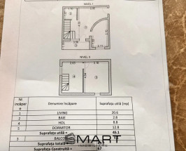 Compartimentarea este una practică,pe doua niveluri. Apartamentul cuprinde la primul nivel un living cu bucatarie, baie si balcon, iar la nivelul superior hol si dormitor. Spațiile exterioare includ 1 balcon cu o suprafață totală de aproximativ 4 mp oferind locuri suplimentare pentru relaxare sau depozitare.