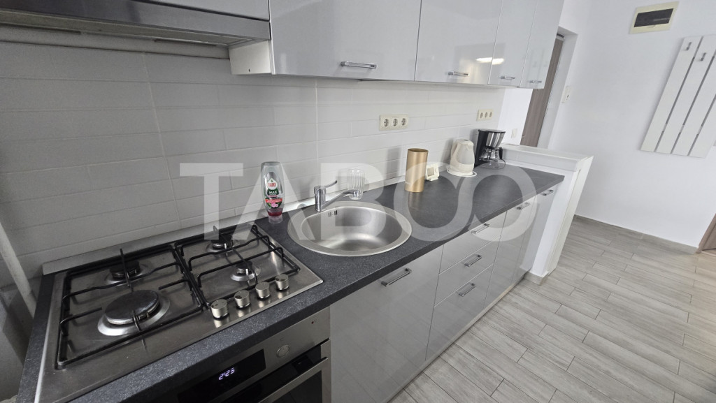Apartament 2 camere de vanzare, decomandat, 59 mp, zona Doamna Stanca, Sibiu. Avantaje majore ale acestui apartament: • Etaj intermediar, caldire cu 2 lifturi • Locuri de parcare in curte cu acces privat • Pretabil investitie sigura TABOO Imobiliare propune un apartament de vanzare cu 2 camere, decomandat, situat in localitatea Sibiu, zona Doamna Stanca, aflat la etajul 5 intr -un imobil tip bloc cu regim de inaltime pe Parter + 11 Etaje; anul constructiei 2015, structura caramida. Suprafata utila de 59 mp + balcon de 5 mp. Apartamentul este structurat astfel: • Hol; • Baie; • Living cu bucatarie si balcon; • Dormitor cu balcon; Finisajele interioare sunt moderne: • Usa intrare: metal; • Usi interioare: celulare; • Tamplarie ferestre: pvc, termopan; • Pereti: vopsea lavabila, faianta; • Podele: parchet, marmura. Utilitati si dotari: • Bucatarie: mobilata, utilata; • Mobilat: complet; • Utilitati: curent electric, apa, canalizare, gaz, catv, telefon, acces internet, fibra optica; • Izolatii: exterior, bloc izolat termic; • Contorizare: apometre, contor gaz, contor curent electric, contorizare separata; • Caracteristici bloc: interfon, supraveghere video, lift, telecomanda poarta acces auto. Apartamentul se vinde mobilat si utilat cu: plita pe gaz, cuptor electric, hota, masina de spalat rufe, frigider cu congelator. Incalzirea se realizeaza prin centrala proprie, calorifere si dispune de sistem de climatizare (A.C.). Se accepta ca si modalitate de plata surse proprii sau credit bancar. Pret: 119.990€ Cod ofertă / ID: P25077 Sună-ne acum la 0369.822.820 și află detalii despre această proprietate de vanzare din Sibiu, dar și despre alte proprietăți potrivite pentru tine. Informatii speciale: 1. Descarcă aplicația pe mobilul tau "TABOO Imobiliare" din Apple Store, Google Play sau Huawei AppGallery pentru a afla instantaneu noile proprietăți care intră pe piață. 2. Dacă ai o proprietate pe care vrei să o vinzi sau să o închiriezi, suntem aici pentru tine! Contactează-ne pentru o evaluare gratuită fără obligații și vei descoperi avantajele de a lucra cu o echipă dedicată și experimentată. 3. Dacă vrei sa incepi o cariera de agent imobiliar, suna la 0369.822.820 si programeaza o intalnire pentru a afla toate beneficiile si avantajele. Intră pe TABOO.ro și descoperă cele mai recente oferte, actualizate zilnic. Anunt actualizat in 5 decembrie 2025. Id intern: P25077