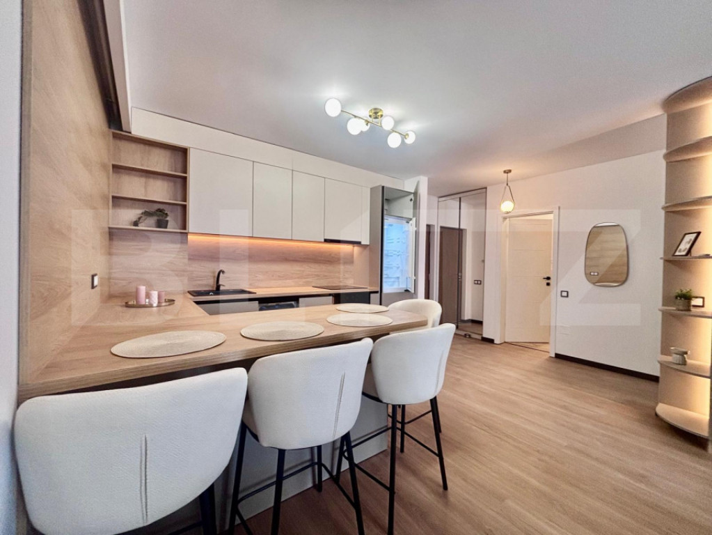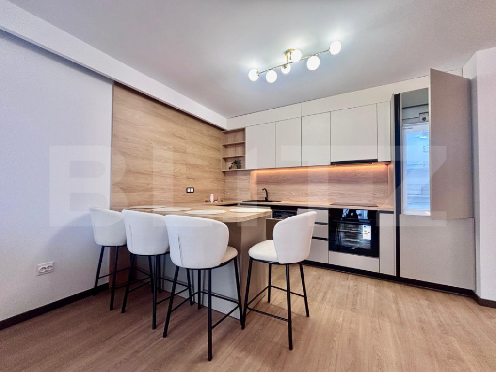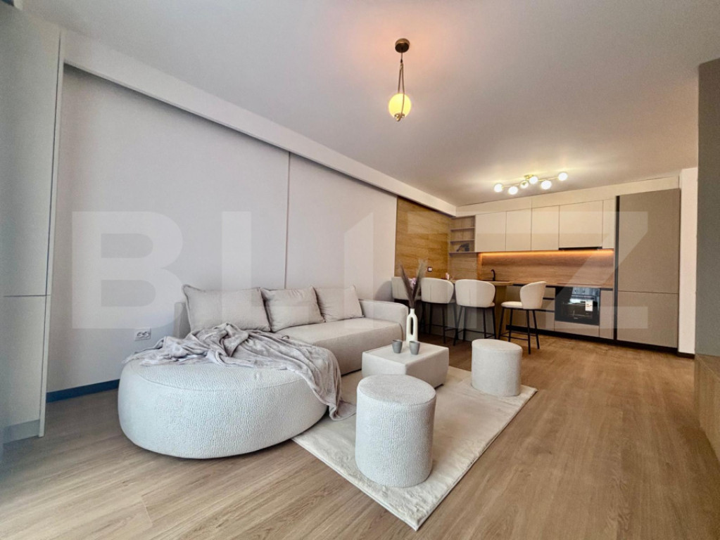 Blitz vă oferă spre vânzare un apartament lux cu 2 camere, situat pe strada Eroilor, într-o zonă foarte căutată datorită accesului excelent către magazine, stații de transport în comun și spații verzi. Apartamentul este poziționat la etajul 1 al unui imobil cu 8 etaje, într-o clădire îngrijită și bine construită. Acesta dispune de o suprafață utilă de 45.10 mp, la care se adaugă o terasa de 8.48 mp, ideala pentru relaxare. Compartimentarea semidecomandată este eficient realizată și se prezintă astfel: living modern cu bucătărie open-space, dormitor luminos, baie complet echipată și hol cu spații de depozitare. Finisajele și mobilierul sunt de categorie superioară, apartamentul avand bucătărie complet mobilată, dotată cu electrocasnice încorporabile, living amenajat modern, dormitor mobilat funcțional si baie complet utilata. Locuința este foarte luminoasă și oferă o atmosferă primitoare, fiind potrivită atât pentru locuit, cât și ca investiție cu randament excelent. Opțional se poate achiziționa un loc de parcare subteran la prețul de 9.000 euro. Nu ezitați să ne contactați pentru mai multe detalii sau pentru stabilirea unei vizionări! Cod ofertă / ID BLITZ: P168253 Id intern: P168253