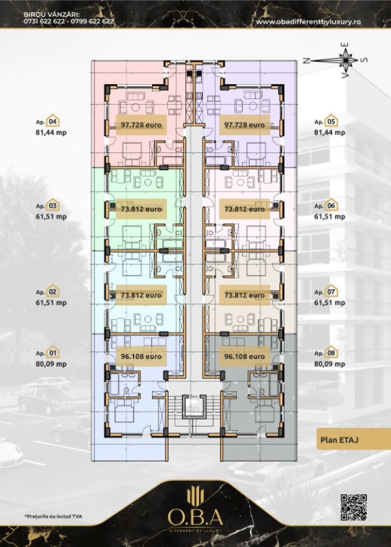 • O.B.A. different by luxury vă propune spre vânzare apartamentul nr. 25, etaj 3• Acasă înseamnă siguranță, liniște și pace! O.B.A. Residence este un nou proiect marca O.B.A. different by luxury situat pe strada C2, în nordul stațiunii Mamaia, ce definește un stil de viață nou, departe de zgomotul și aglomerația orașului, oferind liniștea și intimitatea specifică zonei respective, cât și o vedere panoramică atât asupra mării cât și a lacului. Structurat pe 5 etaje, însumând un număr total de 47 de apartamente cu 2 camere, având suprafețe cuprinse între 55,72 și 81,44 mp, îți oferă posibilitatea de a compartimenta și organiza spațiul după propriile nevoi, ce pot satisface și cele mai exigente gusturi . • Principalele avantaje, finisaje și facilități sunt: - fațadă decorativa mixta - tencuială mecanizată - terase placate cu granit - instalație de încălzire prin pardoseală - tavane extensibile lucioase sau mate de tip barrisol - băi placate cu marmură - finisaje interioare marmură, plăci ceramice, parchet - balustradă sticlă securizată - spațiile comune si casa scări vor fi placate cu marmura, granit, tavanele vor fi de tip barrisol illuminate cu spoturi - lift de ultimă generație - supraveghere video parcare și imobil 24h/24 - stație de incărcare auto electrică - parcare - barieră acces parcare - spatii verzi - loc de joacă - cameră destinată asociației - loc pentru Barbeque-grill Scopul nostru este de a ne diferenția prin CALITATE, ATENȚIE la detalii și multiplele BENEFICII oferite clienților noștri! • Astfel în urmă colaborării noastre cu MOBEXPERT vă oferim următoarele beneficii: - te ajutăm să-ți amenajezi noul apartament oferindu-ți un GIFT CARD Mobexpert în valoare de 10.000 lei, 15.000 lei sau 20.000 lei, în funcție de tipul apartamentului ales; - îți oferim consiliere și servicii de design personalizat oferite gratuit de partenerul nostru, Mobexpert Constanța; - îți oferim un voucher cadou de 10% la achiziții de mobilier și decorațiuni interioare din magazinul Mobexpert Constanța situat pe B-dul Aurel Vlaicu 271 (*Regulamentul Campaniei poate fi consultat pe site-ul nostru) • Oferim servicii diversificate de plată: - plata integrală cu discount; - plata în rate la dezvoltator; - plata eșalonată până la finalizarea construcției; - plata prin credit bancar; - plata standard • Prețul nu include TVA Ansamblu rezidențial OBA Residence C2 (https://www.imobiliare.ro/ansamblu-rezidential/oba-residence-c2-nord)